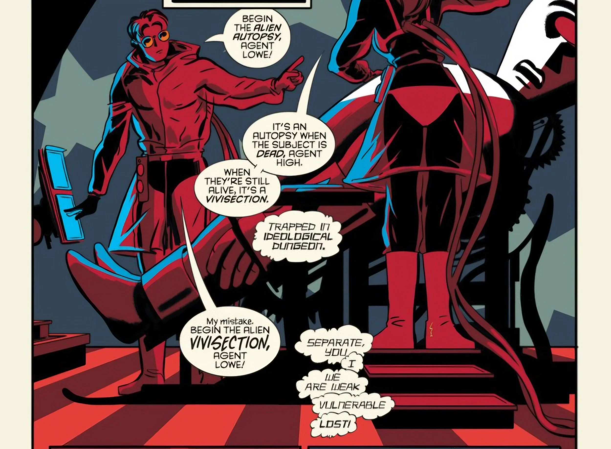 I think another thing I really enjoyed about this issue from a writing perspective was how both John Jones and the Martian are still thematically and literally tethered together. This remains true despite the fact that on the surface, it does not look that way due to their radically different predicaments. The Green Martian is strapped to a surgery table and John is dealing with mental and emotional abuse from Despero. However, I think the comic does a good job visually and through its writing of telling us how John's mind of John is being taken apart and rearranged while the Green Martian is getting his organs and insides taken out and studied.