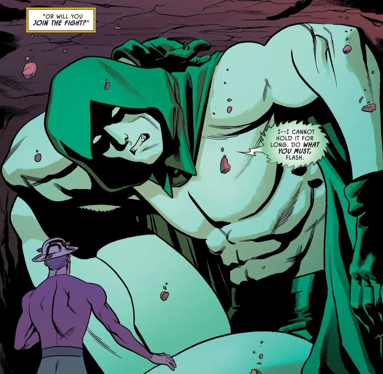 The team divides across three fronts. Green Lantern (Alan Scott) immediately goes on the defensive, using his ring to shield teammates from collapsing debris while coordinating a rescue plan. Flash (Jay Garrick) is pushed to his absolute limits, realizing he can’t cover both the east and west tunnels alone—a rare moment of tactical vulnerability for the Scarlet Speedster.