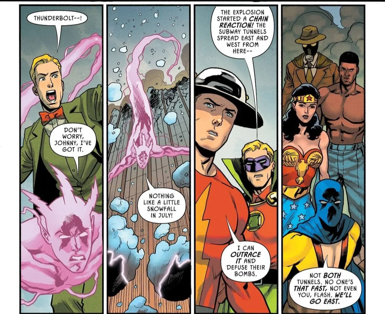 The story picks up exactly where issue #17 left off: the 1940s storyline reaches a literal boiling point. The Ultra-Humanite’s master plan is in full swing, with explosives set to tear through Gotham’s infrastructure. The JSA is split, forced to tackle multiple threats simultaneously as the clock ticks down.