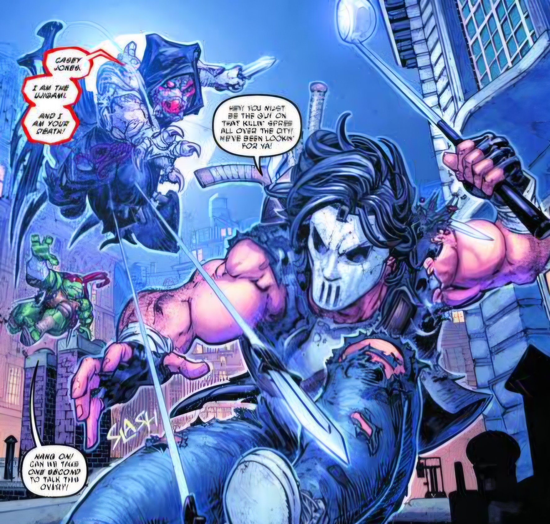 Issue sixteen kicks off directly after the last issue, in which Usagi (Master Splinter) attempts to kill Casey Jones, with Raphael in tow, trying to stop him. Thankfully, Casey Jones escapes, which, if you know anything about comic books, you probably predicted. But then Master Splinter gets captured by the mysterious new villain Shinigami, who doesn’t really get a lot of pages dedicated to her, unfortunately, so we don’t learn as much about her motivation as we did in the last issue.