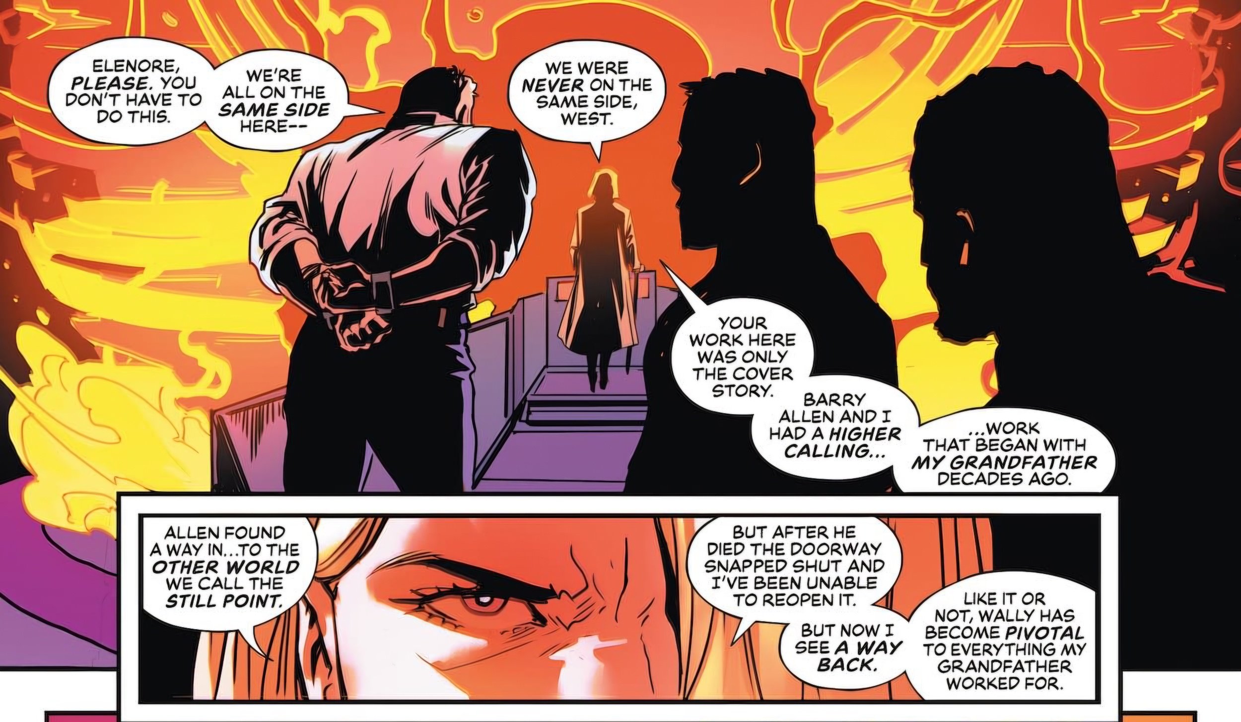 Absolute Flash #10 picks up directly following the events of Issue #9, in which Wally and the Rogues managed to escape Eleanor Thawne’s double-cross while discovering that the Trickster was the mole working for Thawne all along. We also learned more about Thawne’s plan to exploit Wally West’s powers to open a gateway into the Speed Force—a dimension we’ve only seen small hints of so far, but there may be far more at play than we previously assumed.
