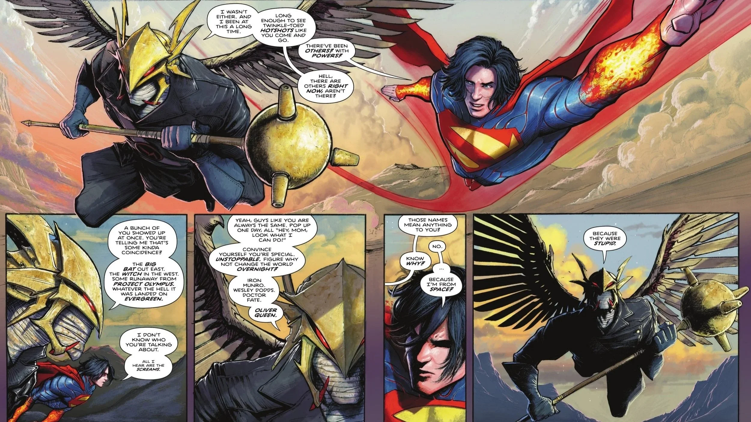 Hawkman and Superman fly side-by-side as the retired archaeologist explains that Kal-El isn't the first flying powerhouse to grace the skies. In fact, even Hawkman wasn't the first, and he’s been active since the '40s. A shocked Superman can't believe there are others with similar abilities, but Hawkman confirms it, dropping references to a "big bat out east," a "witch in the west," a "runaway from Project Olympus," and whatever "landed on Evergreen."