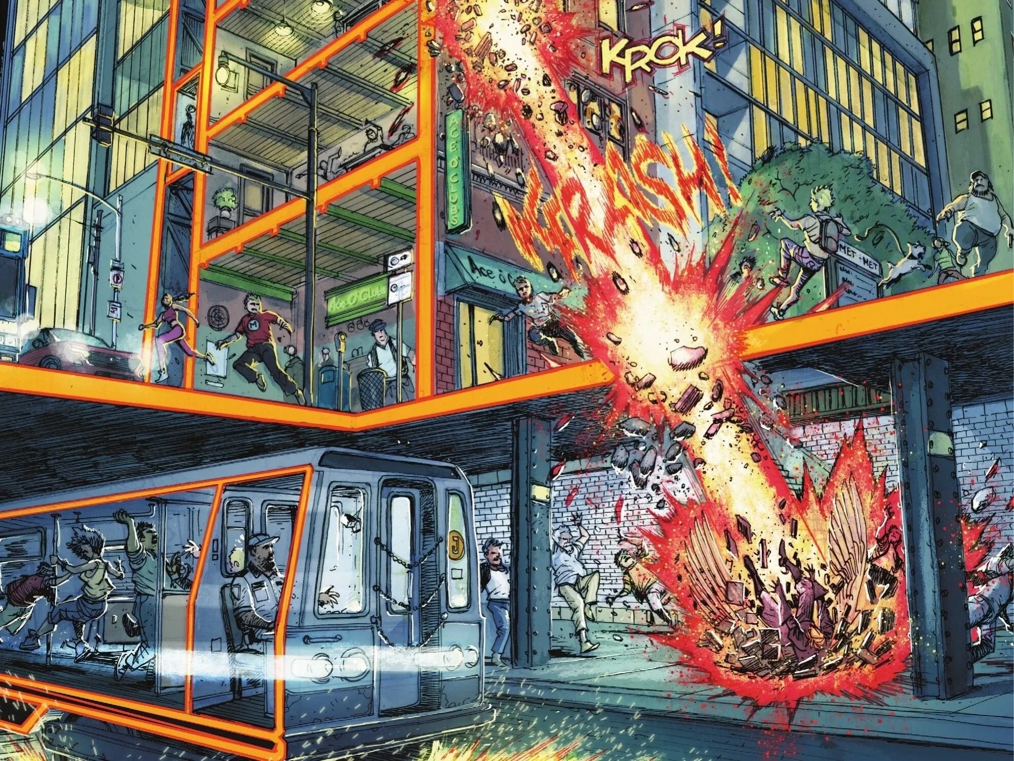 The highlight of the issue is the battle between the two flying powerhouses. The pacing and sheer violence almost reach the levels of brutality we saw in Superman’s fight against Ra’s al Ghul, showcasing the ruthless, methodical efficiency of a seasoned Hawkman. Of course, Superman’s raw power is perfectly captured in the stellar scene where he puts Hall down with a single blow. The buildings and subway are cleverly rendered in an "X-ray" style, allowing us to see every minute detail of the thunderous crash. It’s a level of visual storytelling we don’t often see when characters are simply punched through walls.