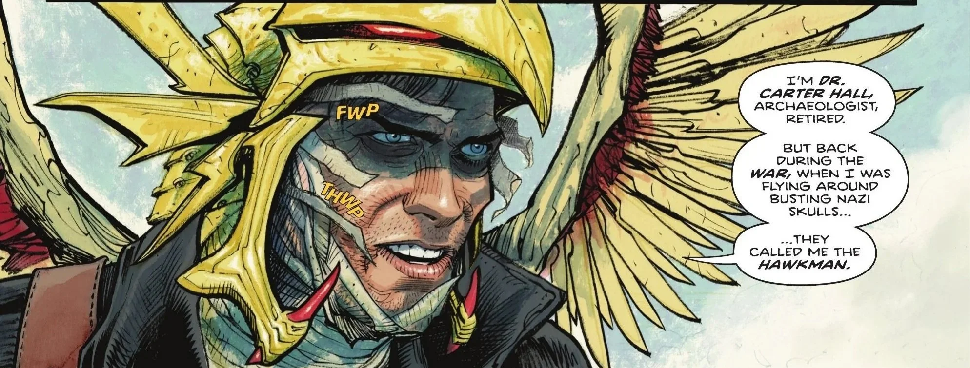 His helm and bandages retract, revealing the rugged, worn visage of Carter Hall. He formally introduces himself and explains that while he is human, his suit is alien—composed of Nth Metal from a planet called Thanagar. He asks Superman if the name rings a bell, assuming Kal is "from out there," to which a surprised Superman asks who told him he was an alien. Hall simply smiles smugly, noting that Superman just told him himself. "You have a lot to learn," Hall remarks, inviting the Last Son of Krypton to take a walk with him.