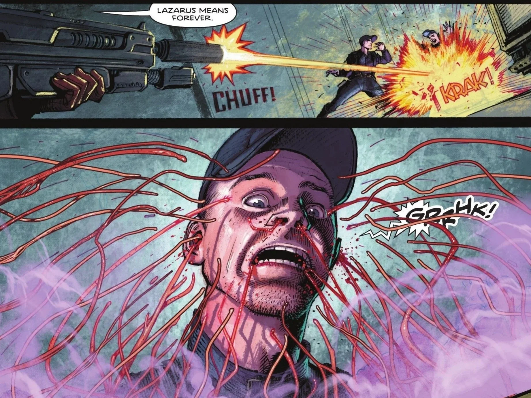 As the crate ruptures, we’re met with a gruesome and horrifying sight: a purple mist wafts around the nearest G.A.T.E.S. agent as tendrils reach out, burrowing into his skin and orifices.