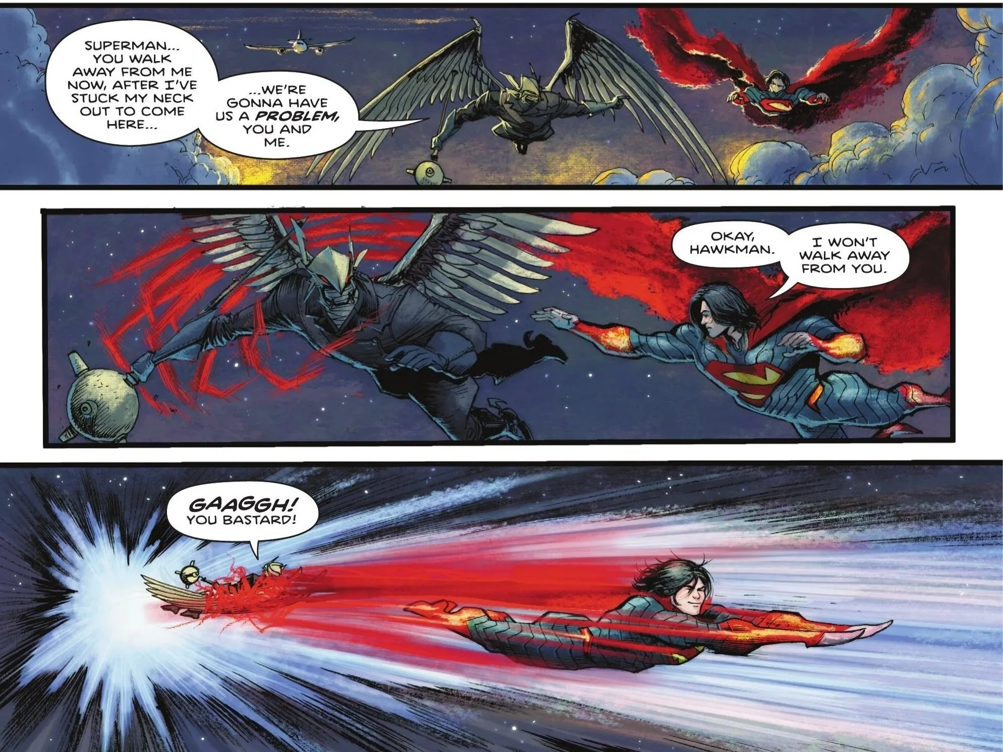 When Superman remarks that there are people in trouble, Hawkman callously replies that there are always people in trouble, but "they’re talking here." Superman pulls his hand back, noting Hawkman’s incredible grip strength and asking if he’s even from Earth. Hawkman dryly replies that he was born and raised in Gotham City—though you wouldn’t catch him dead there these days.