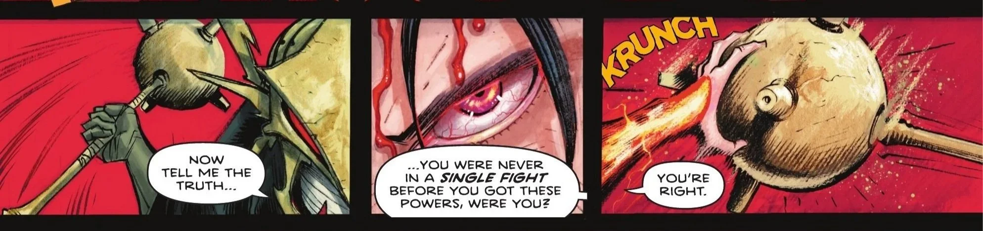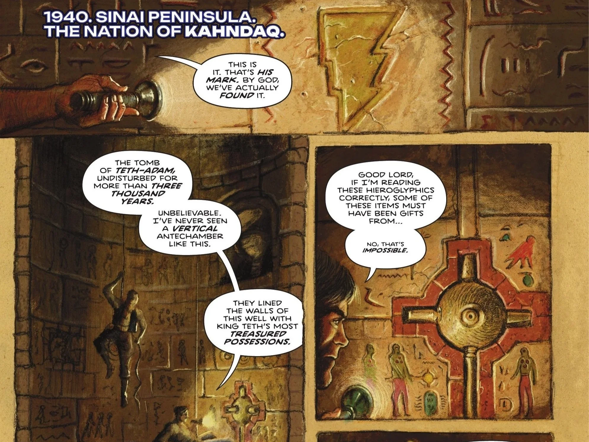 Our issue begins with a flashback to 1940 in the Sinai Peninsula, within the nation of Kahndaq. That brief introduction—accompanied by a hieroglyphic image of a thunderbolt—immediately sets a brooding tone as the DC Absolute Universe continues its expansive world-building. Two archaeologists confirm what the narrative text suggests: the tomb of Teth-Adam has been found.