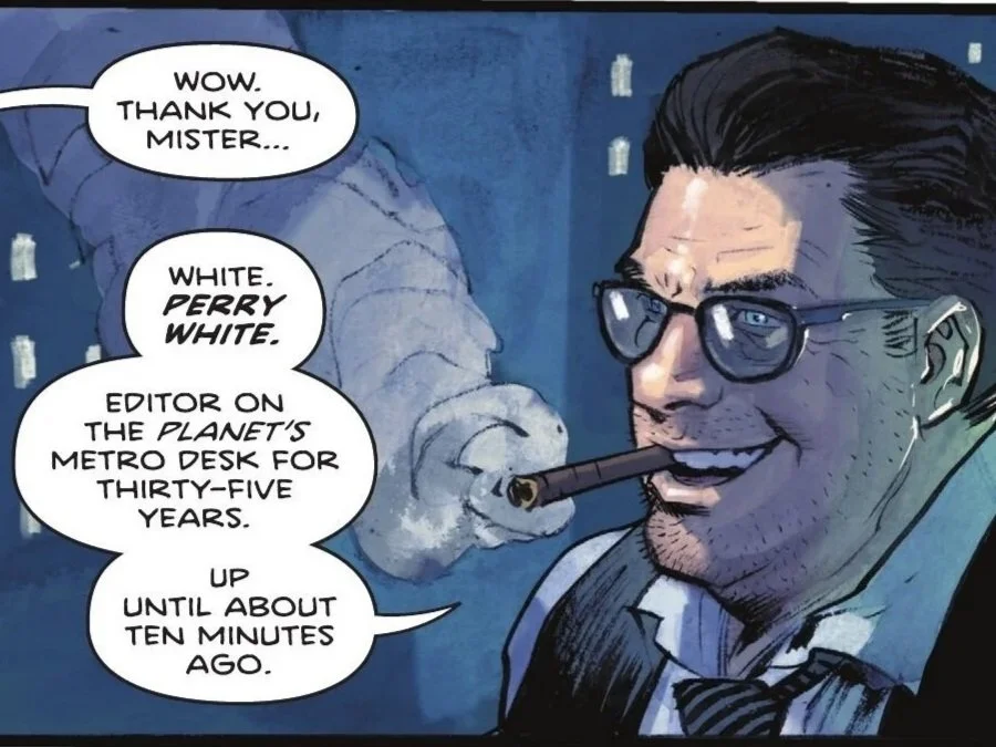 The man wishes her luck on her interview, prompting a surprised Lois to ask how he knew why she was there. He reveals he’s a fan of her work, describing her prose as "more Faulkner than Hemingway" (especially regarding her Superman coverage), but admits she has "the goods." When she asks for his name, we are formally introduced to the Absolute Perry White, editor of the Planet’s Metro Desk for thirty-five years—up until ten minutes ago.
