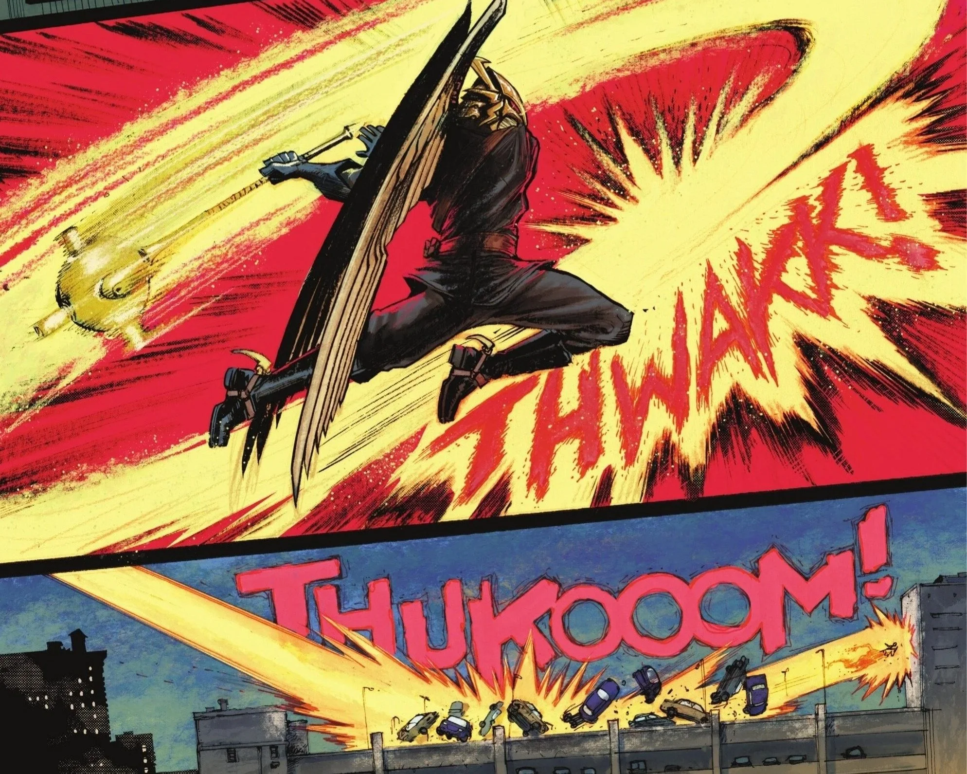 Meanwhile, as Superman races toward Metropolis, he spots a crisis—one that we, the readers, can't quite see yet. He releases Hawkman from his cape, urging the veteran "hero" to help him respond, but Hawkman’s answer is a thunderous blow to Kal-El’s back with his oversized mace. The strike sends Superman crashing through the roof of a parking garage. As Kal gets his bearings, he demands to know what the hell is wrong with Hall, reminding him that people need help right now.