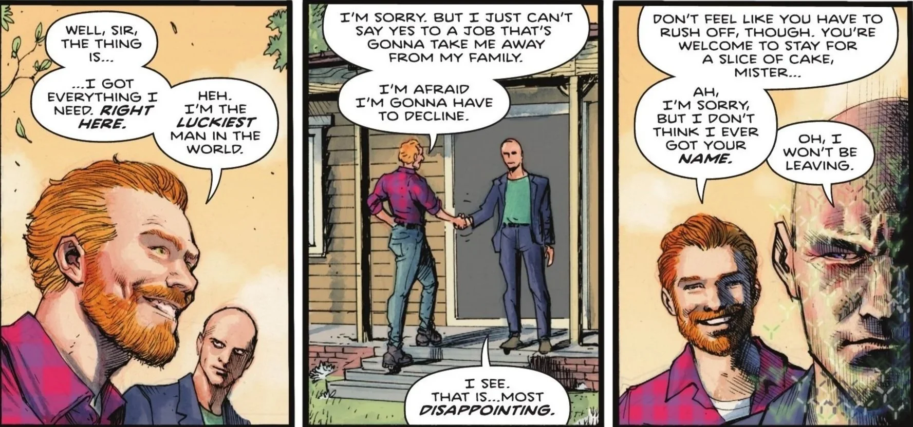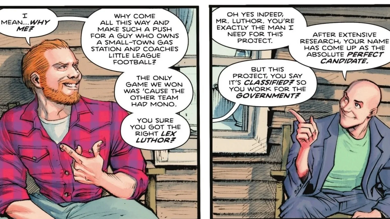 Our issue nears its conclusion, shifting from the chaotic streets of Metropolis to the quiet suburbs of Missouri. It’s an idyllic scene: two men speaking on the front porch of a modest home. The first man—a redhead with a beard and a flannel shirt—is revealed to be this world's Lex Luthor, who has apparently been given a generous offer he doesn’t quite understand.