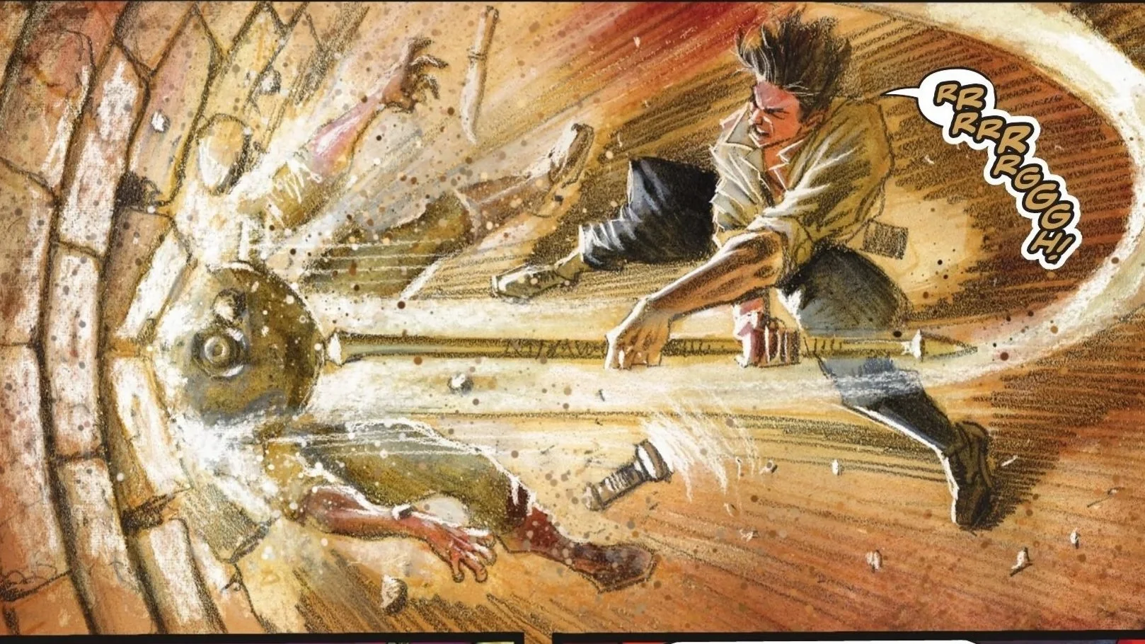 However, the expedition takes a dark turn when Hall’s associate, Bradford, cuts his rope. Revealing himself to be a traitor on the Nazi payroll, Bradford scoffs that Berlin pays better than Lazarus ever could. As Hall dangles over a deadly drop, he shouts that if the legends are true, this tomb contains artifacts that could change the course of the war—and he refuses to let them fall into Hitler’s hands. Bradford merely sneers, grimly noting that just because the Allies are fighting Hitler, it doesn’t automatically make them the "good guys." He leaves a straining Hall to his fate and descends further into the darkness. As Hall’s grip finally fails, he instinctively reaches for the handle of the giant mace. He screams as a strange, golden substance begins to envelop his hand and wrist...