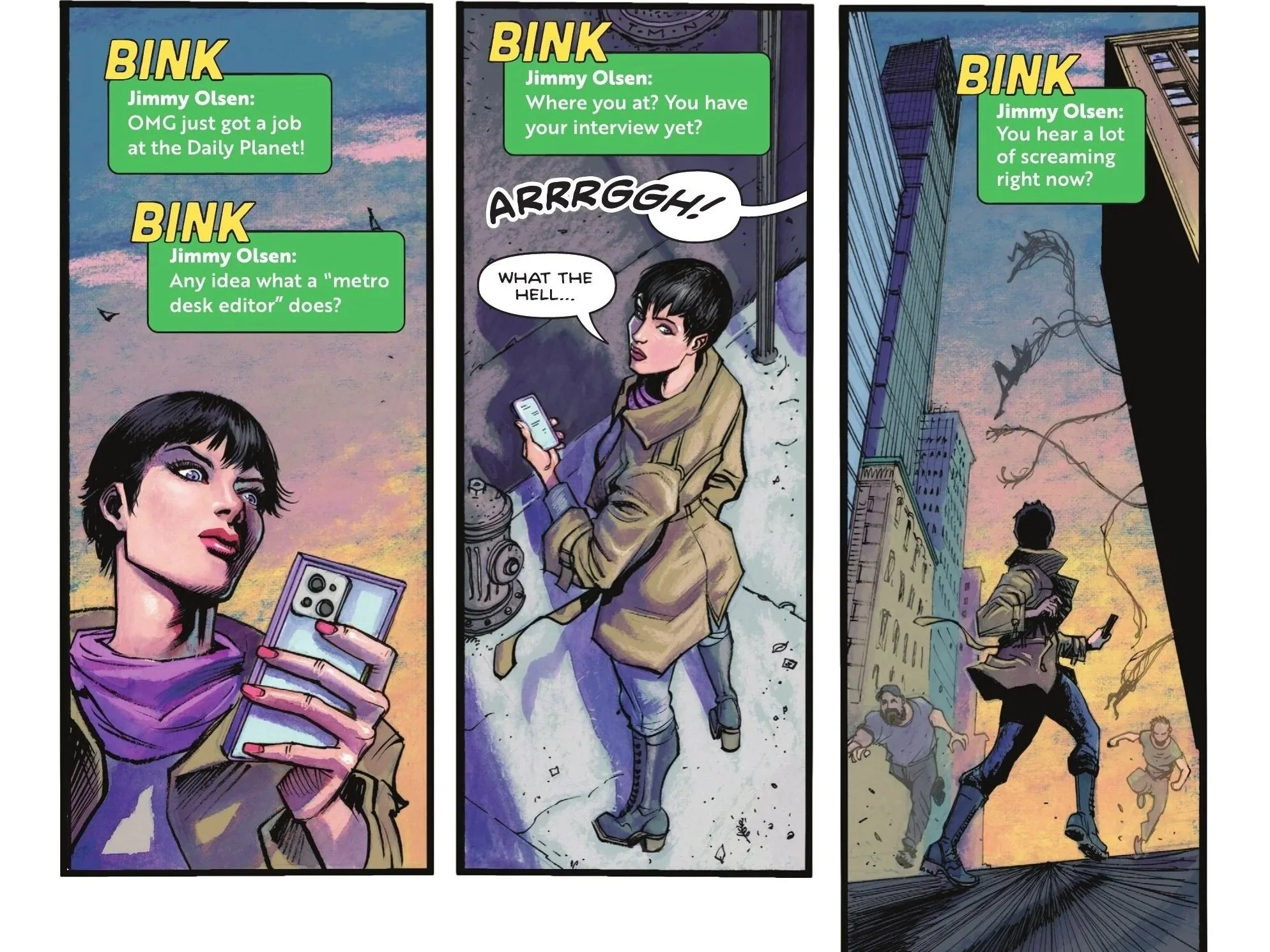 Right after the fact, Lois gets a text message from Jimmy Olsen who excitedly tells her he got a job at the Daily Planet and follows that up by asking her if she has any idea what a “metro desk editor” does.  Jimmy asks if she’s had her interview yet as the sounds of screaming prompt Lois to look up to see a startling sight: people running away as strange tendrils are grasping people off the streets…