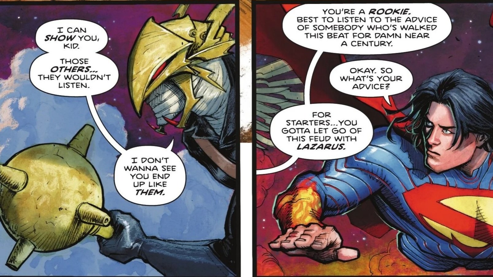 In the present, Hawkman explains that he can show Superman the "right way" forward, insisting he doesn’t want Kal-El to end up like the others who ignored his counsel. He offers to take Superman under his proverbial—and literal—wings, but his first piece of advice is a hard pill to swallow: Superman needs to let go of his feud with Lazarus Corp.
