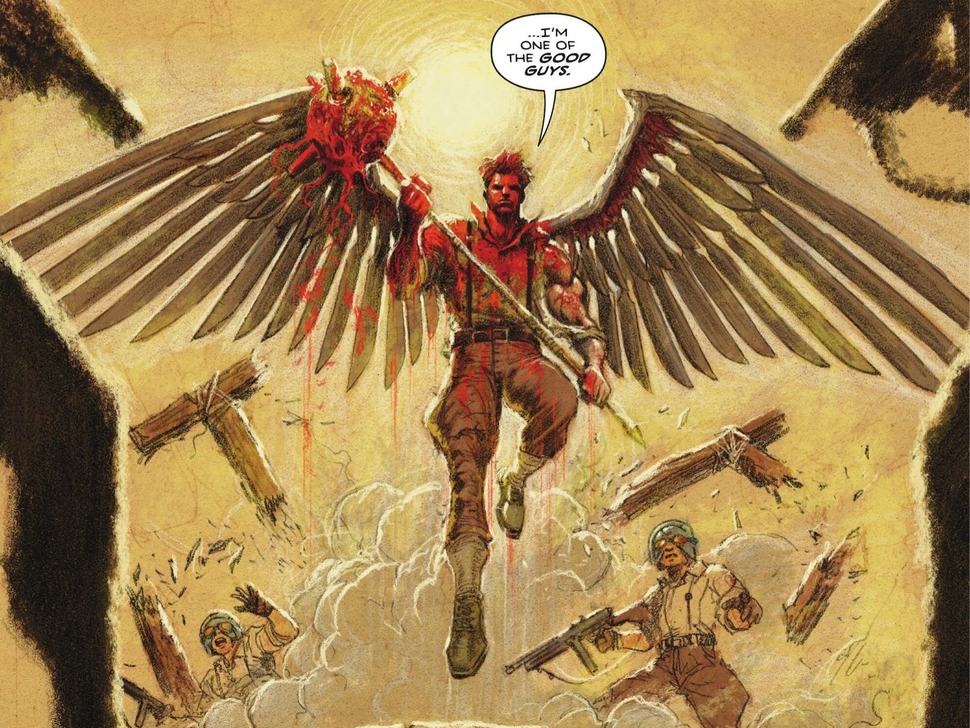 We are then treated to a glorious image of a blood-streaked Carter Hall flying out of the well, his newfound wings spread triumphantly as the Peacemakers watch in awe. It’s a powerful moment that effectively gives us the origin of Absolute Hawkman.