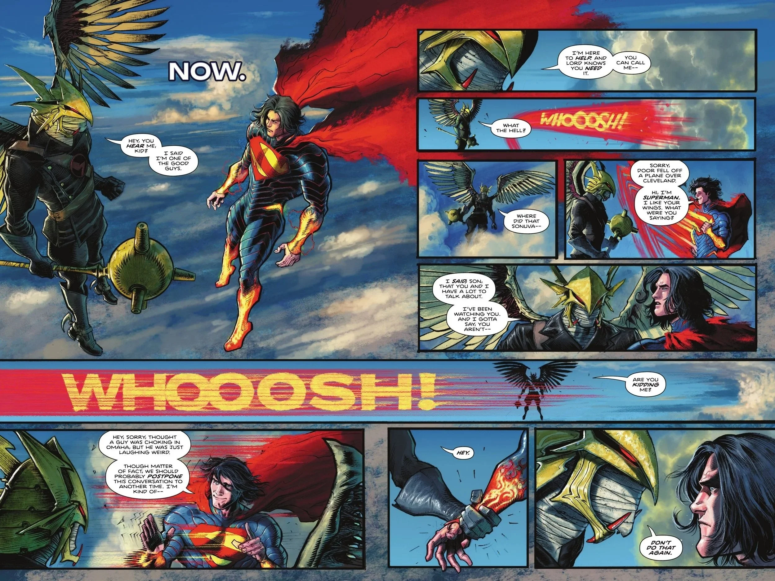 In the present, we pick up where our last issue left off: Hawkman confronting Superman in the skies above as the latter is struggling to block out the constant cries for help he hears around the world. Hawkman is in the middle of explaining that he’s one of the "good guys," but Superman is far too distracted by his dialed-in senses to listen. Just as Hawkman offers his help, Superman bolts—returning a moment later to apologize, explaining he heard a door fall off a plane over Cleveland and had to intervene. Clearly annoyed, Hawkman reiterates that they have a lot to discuss and that he’s been watching Kal-El for some time... only for Superman to vanish again. He returns sheepishly, admitting he thought he heard someone choking, though it turned out to be a "weird laugher." He suggests they table the discussion, but Hawkman isn't having it. He firmly grasps Superman’s wrist, sternly telling him not to walk away again.