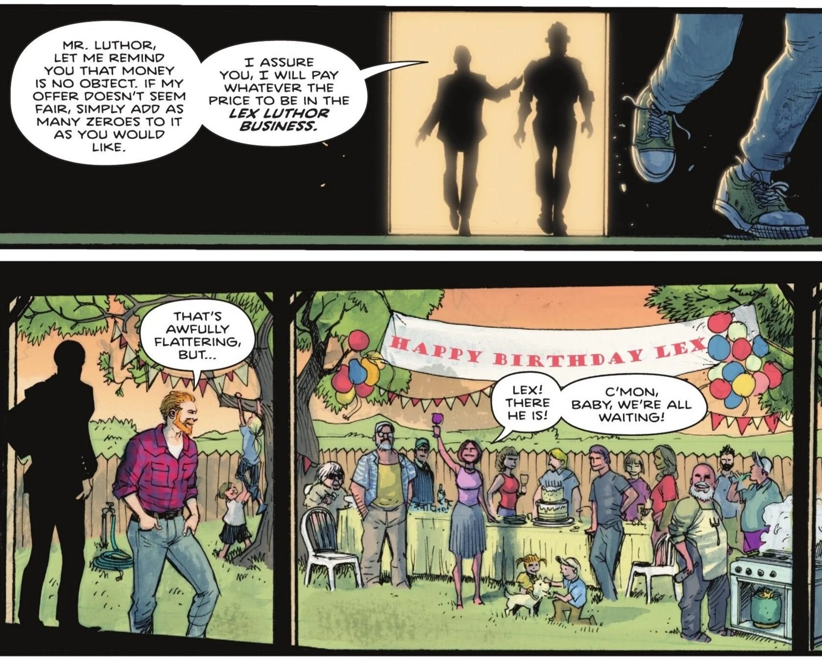 The stranger offers Lex any conceivable amount of money—literally inviting him to add as many zeroes as he’d like. But as they move to the backyard, revealing a lively birthday celebration filled with neighbors and family, Lex politely declines. He is happy and content with the life he has; he can’t take a job that would pull him away from his family.