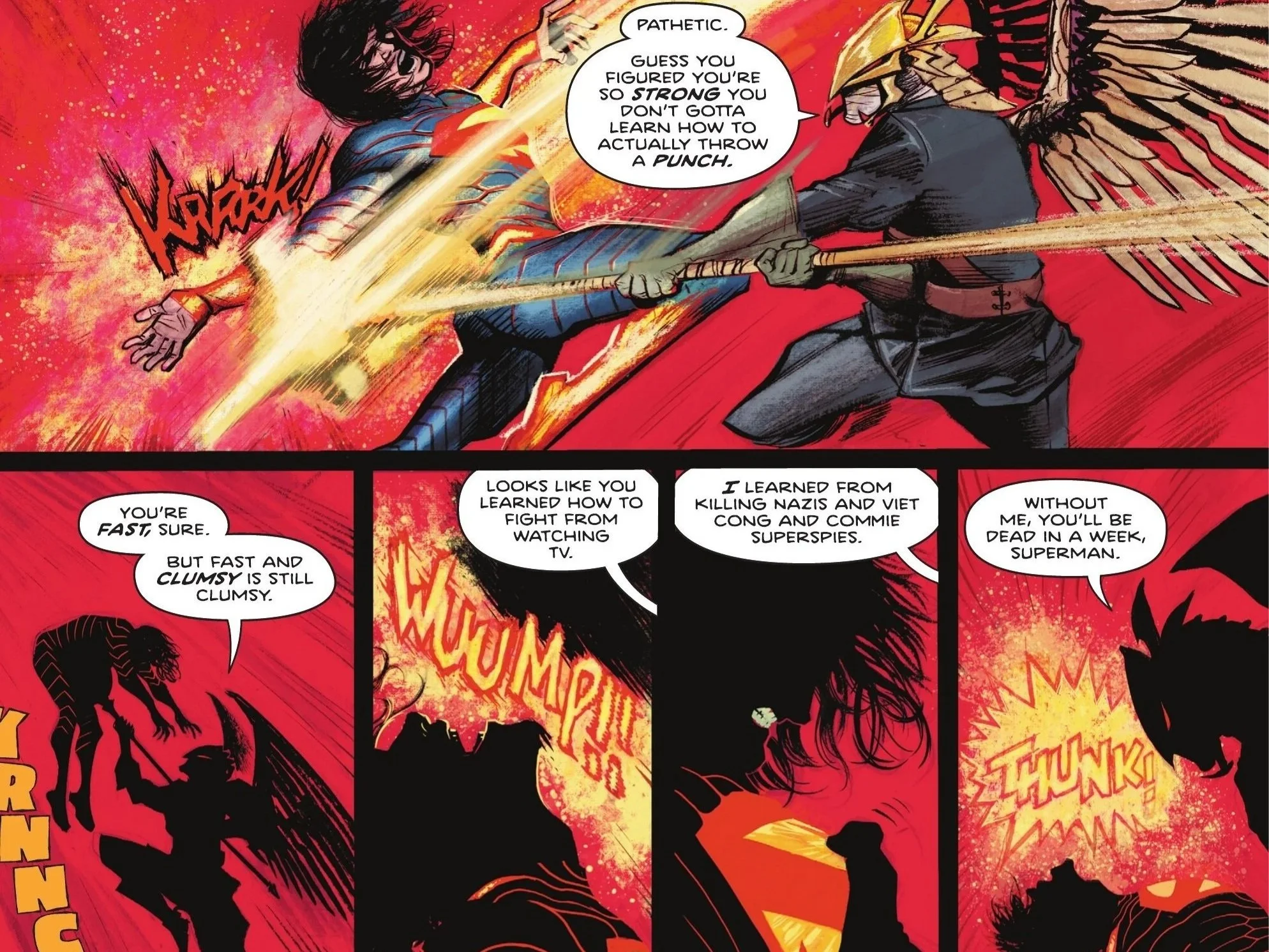 Hawkman uses his vast experience to dominate Superman in combat.