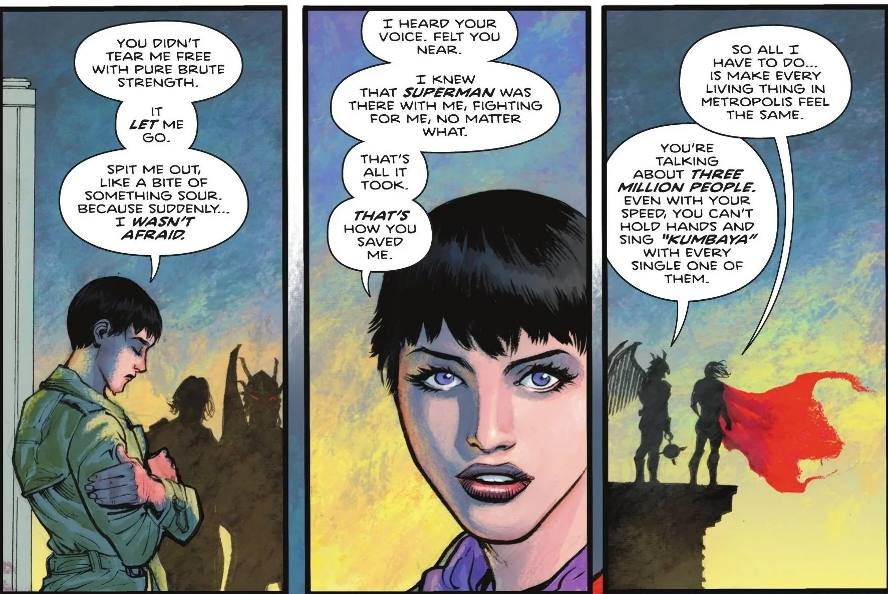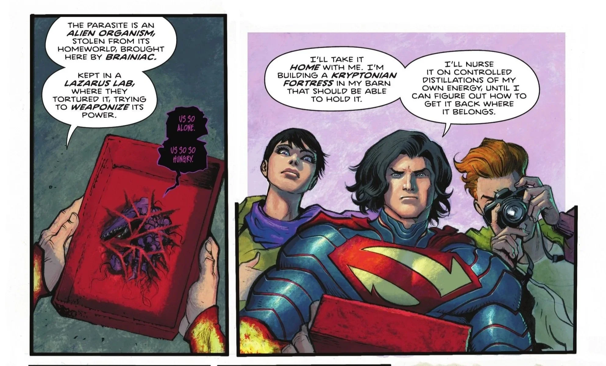 Outside in the real world and not within Parasite's nervous system we see the monster suddenly rupture and explode! Hawkman is amazed as he’s suddenly freed, shocked that Superman actually did it. In a blur of red, Superman begins rescuing the now freed citizens one by one as they all share that it was due to his presence that they felt safe and everything was going to be okay. Hawkman rescues his share of civilians as he asks Superman how he was able to do it. A weakened Superman simply replies with “I’m Superman”, unsure of the logistics himself. Hawkman demands he speaks up as Kal gets to his feet as the crowd surrounding them looks on in awe. We briefly return to Orangi Town as Ra’s reluctantly leaves his cell with Talia, remorsefully apologizing to Superman with the confession that “we are who we are”. The leader of Lazarus departs with his daughter, but not before gently leaving behind the card that was given to him from the children of his many victims. Back in Metropolis, Superman soars through the sky, a civilian being carried to safety as the city cheers him on. Soon after, Superman takes what’s left of the Parasite and places it in a container as the creature weakly mutters that it’s so hungry. He reveals that the creature must be an alien organism, stolen from its homeworld by Brainiac and tortured and weaponized by Lazarus. He decides to take it home with him, building a Kryptonian Fortress within his barn to hold it as he nurses it with controlled distillations of his own energy until he can figure out how to get it back to where it belongs. Hawkman swoops down and his demeanor is somewhat different as he attempts to get a word in to Superman. But Superman isn’t having it and cuts straight to the chase, asking Hawkman if he remembers the message he gave him back inside Parasite. We cut back to those moments as we discover that Kal in no uncertain way told Carter that he knows who he works for, Lazarus and everyone like them. More than that, he plainly states that he’s coming for the powers that be and cuts deep through to Carter with his words, claiming that unlike him, Superman is not for sale. Hawkman contacts Talia as the Last Son of Krypton soars off, telling her that they have a problem.