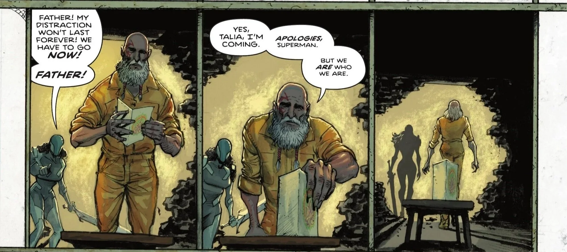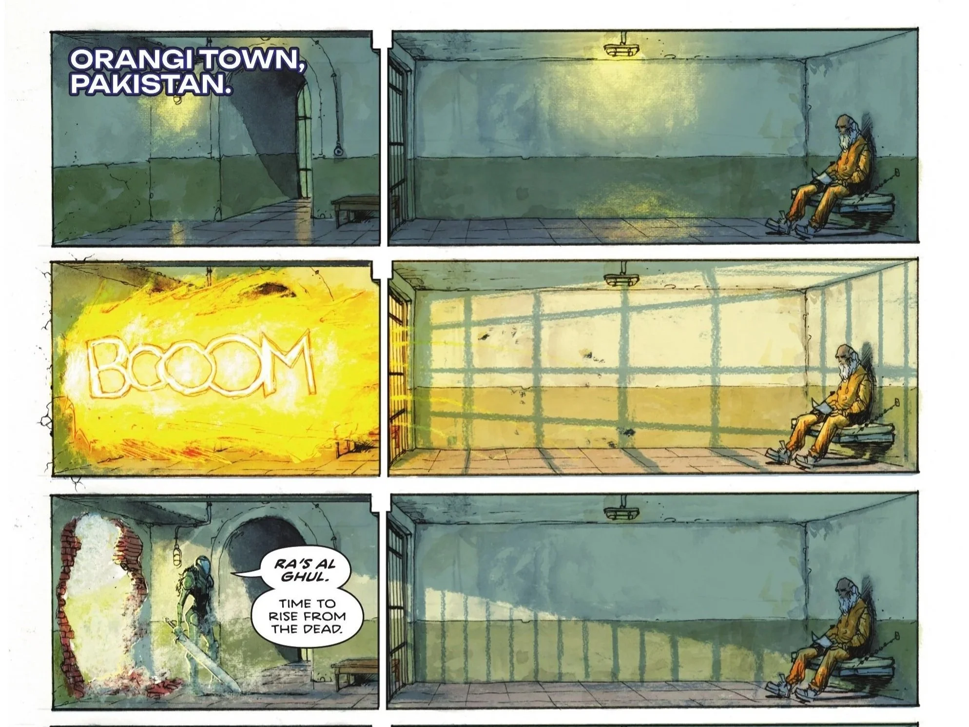 We shift gears and go to Orangi Town, Pakistan as we see the withered and rapidly aged Ra’s al Ghul sitting in his cell. The wall to his cell explodes as an armored Talia steps forward, ready to free her imprisoned father. She reveals that the releasing of the Parasite virus was done purely to distract Superman so she could spring him free, but Ra’s simply responds that she should not have come there to him. Peacemaker Corpsmen arrive shortly after Talia’s entrance, who can’t believe that her once mighty father has been seemingly broken by a mere few months in a third-world jail. Ra’s doesn’t really wish to argue and instead asks her to leave him be. Talia claims his broken spirit can be revitalized just as much as his broken flesh, but Ra’s wearily begs her to just leave him to die.