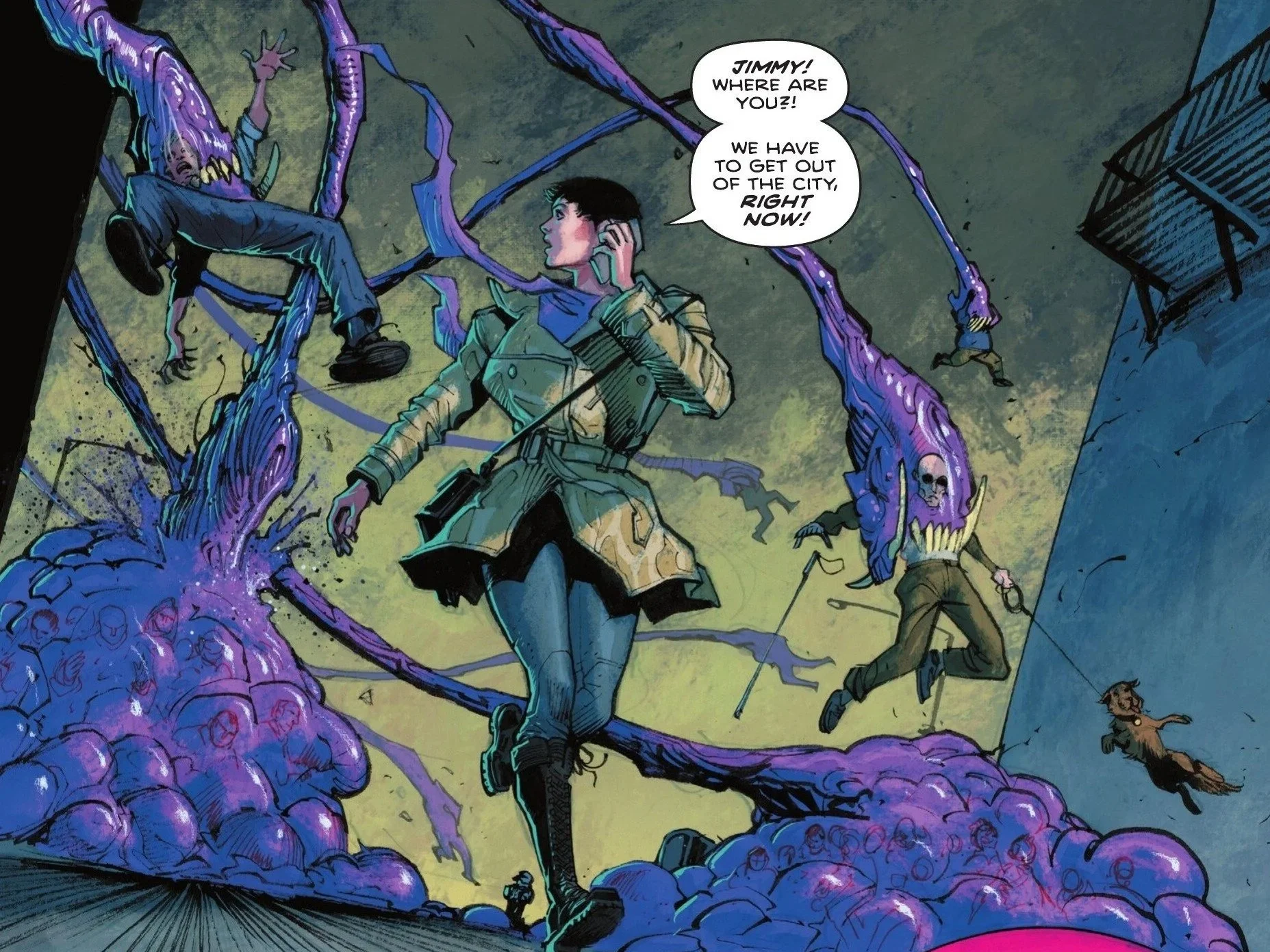 In what is probably our darkest and most visually disturbing issue to date, the story kicks off right as the gruesome Parasite begins grabbing victims with its purple mawed tentacles right in the heart of Metropolis. Lois is smack dab in the center of it as she tries to get a hold of Jimmy. Lois takes off, desperately trying to escape the fate of the citizens of Metropolis only to come across a horrific sight: Jimmy (along with countless other citizens) trapped within a messy web like cocoon, bleeding from his orifices as he begs Lois to kill him. She levels a gun at her friend and trembles before retreating, apologizing for being unable to pull the trigger. She dives into the water to escape Parasite’s tendrils as the creature itself begins to speak in broken English, claiming it is no longer hungry, no longer needs anything, and given the people it has absorbed into its form, no longer alone.