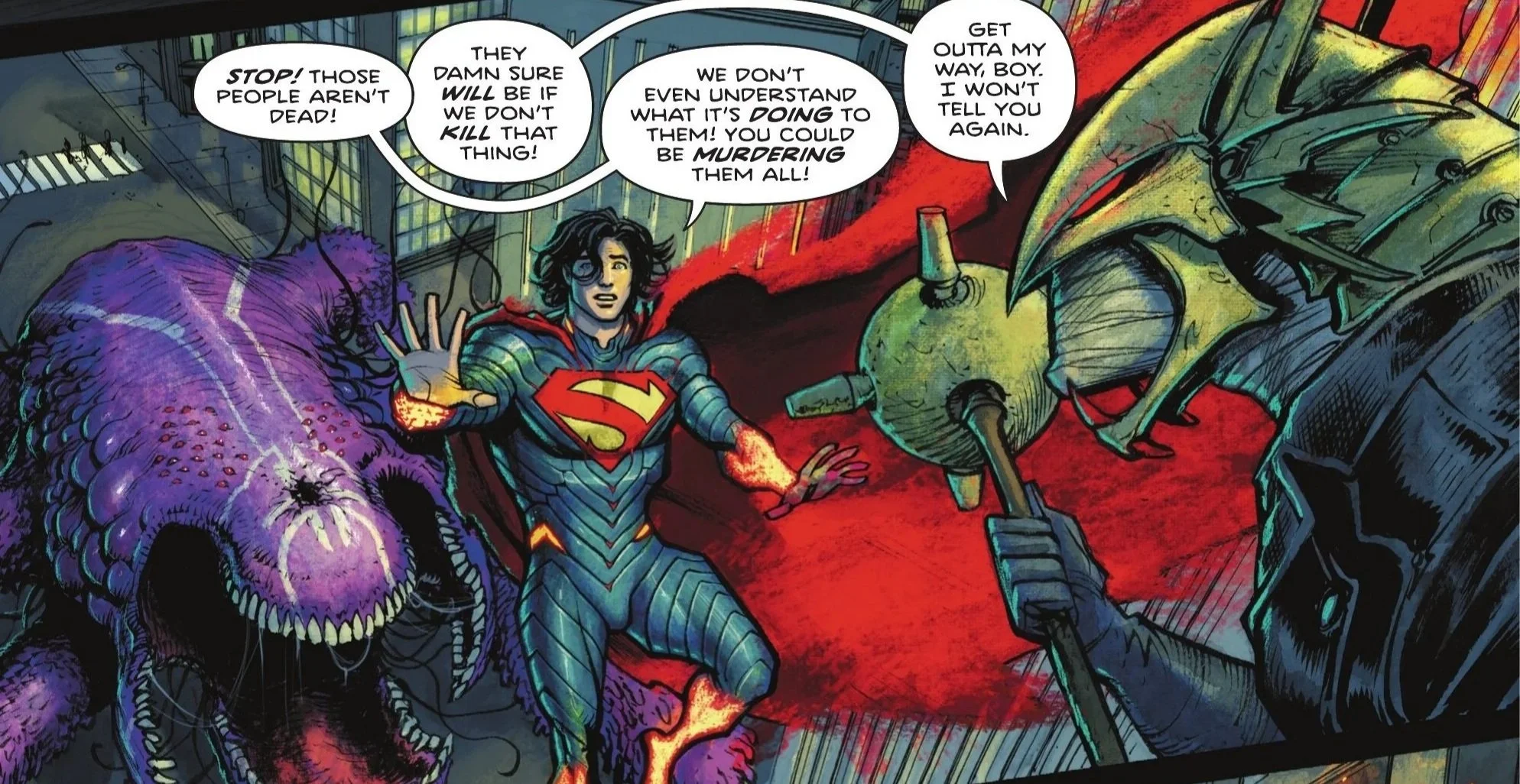 Above in the sky, Superman tries to block out the screams as he and Hawkman assess the situation. As Superman points out the creature's rate of growth, Hawkman does as Hawkman does, scoffing at Superman’s caution and flying right through the giant monster. The creature howls in pain but Superman discovers that the citizens it has absorbed are still alive and not dead. This doesn’t seem to concern Hawkman, however. As the two argue, Parasite knocks the two of them into a building, crashing through the window. Superman realizes Hawkman knows more about the creature than what he’s letting on. He soars towards one of the cocoons filled with still alive citizens trapped within Parasite, ready to start putting them out of their misery, when he’s stopped by Superman. As Superman is about to admonish Hawkman, he hears Lois’ voice and immediately soars off towards her.