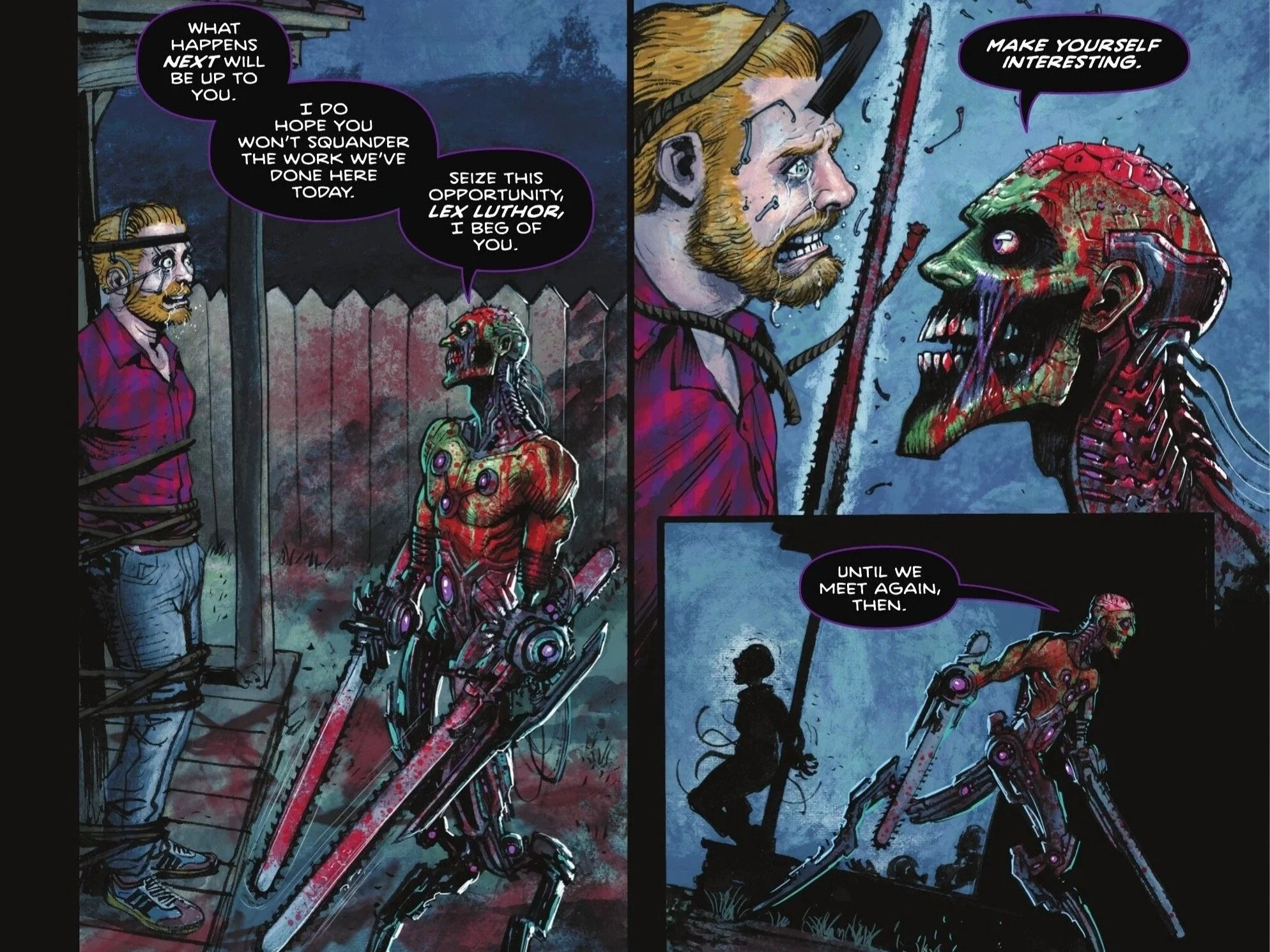 Our issue concludes as we head back to Missouri to see a harrowing sight. Lex Luthor, eyes forced open due to a mechanical contraption on his head, has tears running down his face as softly begs Brainiac to stop. Brainiac agrees as he, in an almost casual conversational like tone, asks Luthor to live up to his potential and to seize the opportunity before him, to make himself interesting. We can clearly see that the backyard fence is covered with blood, as is Brainiac himself and his chainsaw limbs. He releases Lex from his restraints and departs in an almost polite manner as we see the anguished husband and father drop to his knees as he sobs before the gruesome sight of his family, including his wife and children, cut into pieces and laid out about before him as our comic finally draws to a close.