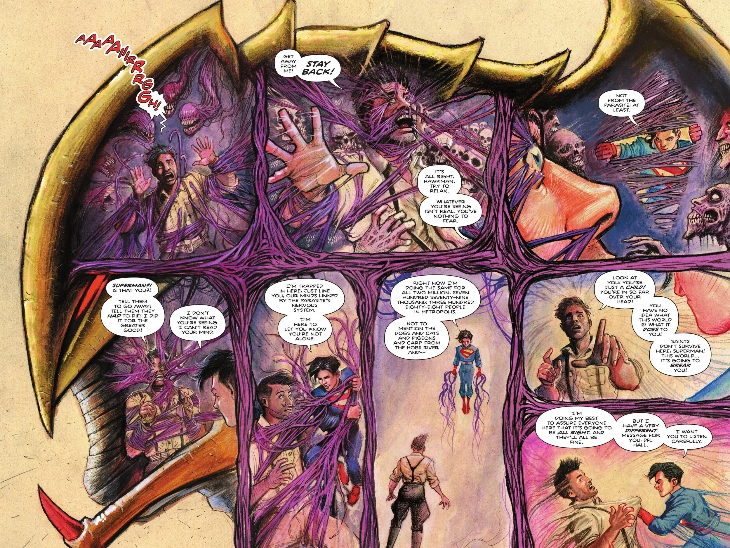 Superman appears before the Parasite and introduces himself as Kal-El of Krypton. He starts to open up a non-threatening line of dialogue that is quickly cut off as tendrils race towards Superman and begin draining him. The creature suddenly expands to triple its size as even Hawkman is caught in its web-like substance. Hawkman is shocked over how powerful Superman must be in order to elicit such a response from the creature as he is enveloped. Lois encourages Kal that he can do this as he relaxes and beings to connect to Parasite and those trapped within. We actually go inside Hawkman’s mind as we see him not as the winged super”hero” he would become but as Dr. Carter Hall. He’s screaming and begging to be let go as Kal-El rips through the barriers to reach him. Curiously enough, the mental image of Kal is him as a young boy, the same age he was when Krypton was destroyed. Carter exclaims that he had no choice to kill them but Kal merely responds that he can’t read his mind nor see what exactly the terrified archeologist is seeing as he begins to pull him free from Parasite. Despite moving around in Carter’s mind, Kal isn’t actually here and he’s just as trapped as he is, but he’s nevertheless telling him and countless other victims that they’re not alone. Carter exclaims that Kal’s just a kid and one who doesn’t know just how awful the world is and what it will do to him. Kal simply says he has a different message in mind for him.