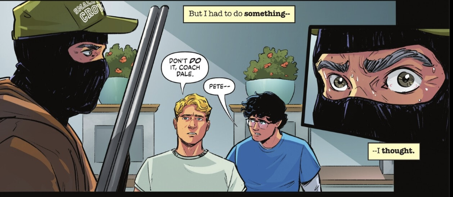 Those panels include: when Jonathan Kent first sees the word foreclosure in the bank's letter to the Kents; the look of horror on Coach Jerry Dale’s face when someone recognizes him under the mask at the bank; Superboy breaking into the abandoned gold mine; Superboy’s face as he tells the Kents their logic is “dumb;” and Superboy revealing to Smallville that the corrupt banker is trying to sell their land. Those are just a few specific examples of some of the fantastic art in this book, and it all pops thanks to the outstanding color work of Ivan Plascencia. These two are a dynamic duo on this book.