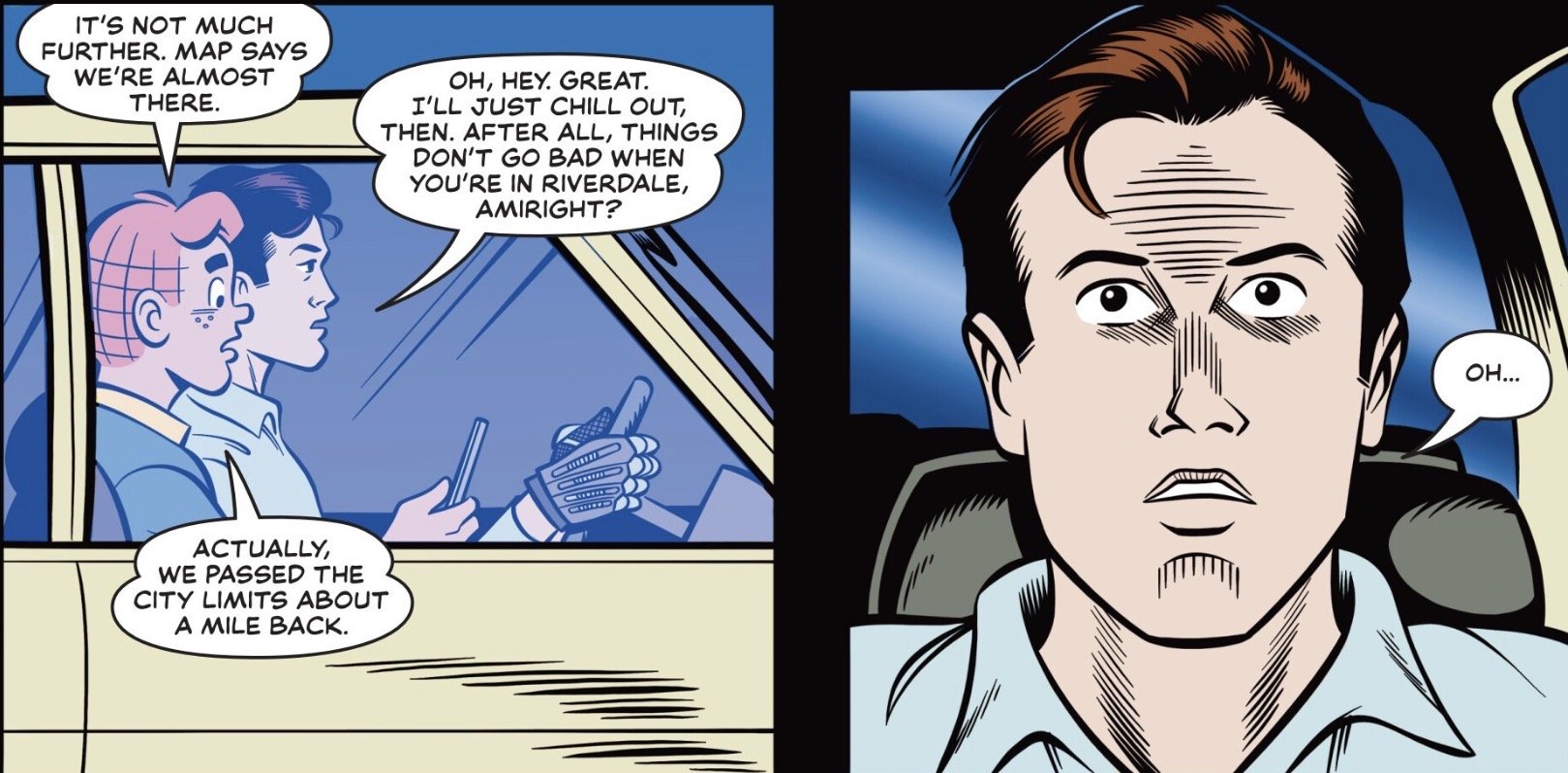 Which makes this the perfect time for a flashback, right? Earlier in the day, Archie and his S-Mart manager, Ashley “Ash” Williams, are taking a breather after a chaotic store-opening sale. Ash gives Archie his first paycheck, and the next thing you know, there’s a cartoonish dust cloud where the kid was standing just a moment ago. Archie is all set to head to Reggie’s party, but his car won’t start. Luckily, Ash is there to give him a ride in his boat-sized “classic” car.