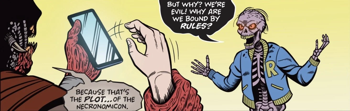 Moving the gang from the cabin to S-Mart is a great idea. It gives us a whole other stage for new setpieces, and it gives the story a little more of that Army of Darkness feel. Making Bad Ash the leader of the Deadites adds to that feel as well, even though it makes no logical sense - a) he was already defeated in the movie, and b) Archie read from the book, not Ash, so even if he was still around (he’s undead, after all), why would he specifically be summoned by the partial incantation?