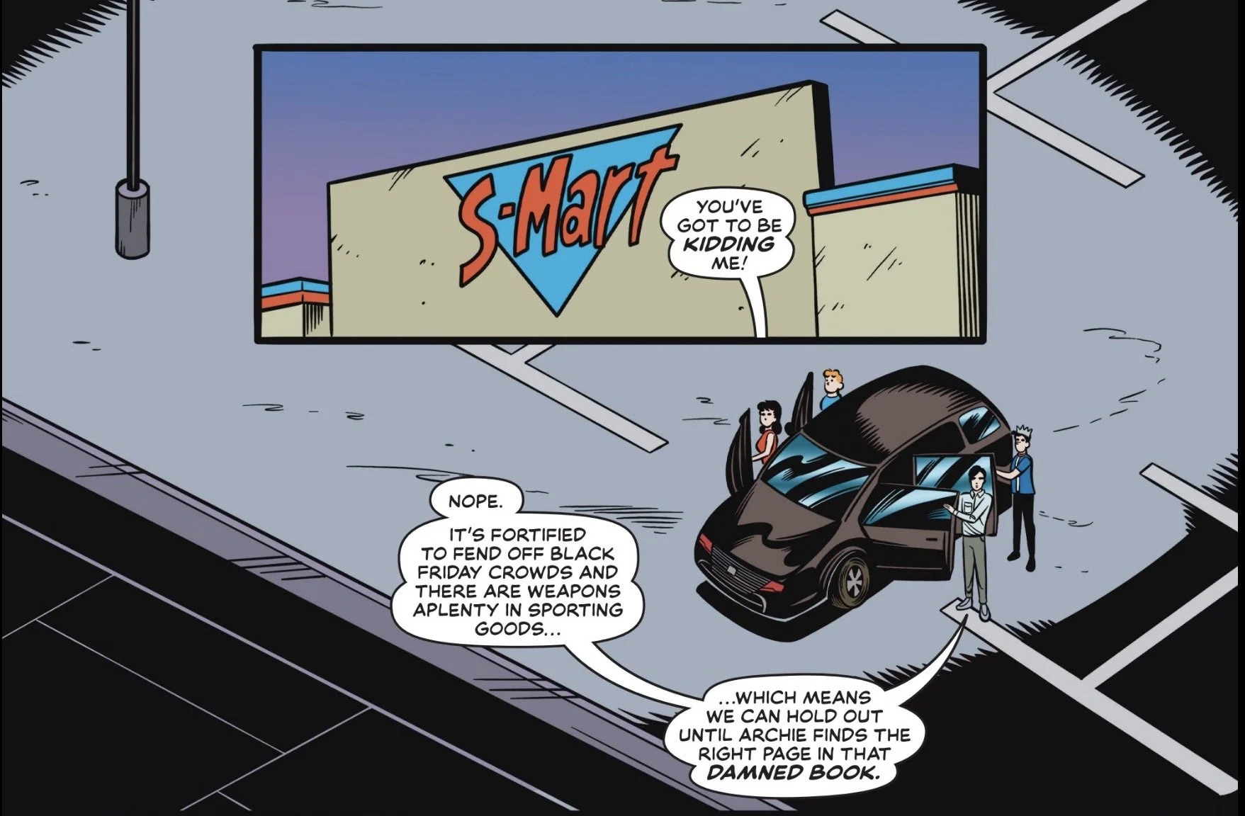 Once the mini Demon Dogs are dealt with, it’s time to get out of the cabin and to somewhere with weapons. Piling everyone into Veronica’s SUV, which was in the garage (can’t park outside where the birds can get to it, after all), the gang burns rubber to the most defensible place in Riverdale: S-Mart.