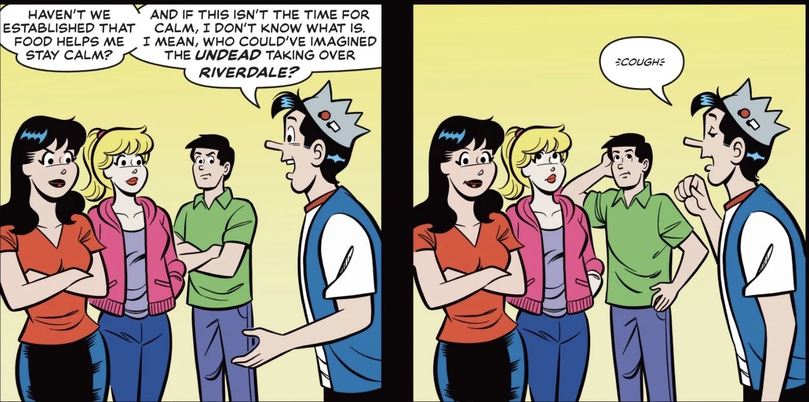 Archie, Betty, Veronica, Jughead, Reggie, and Ash are all trapped inside the creepy cabin in the woods that Reggie's family inherited. After Archie partially read from the Necronomicon, the place was besieged by Deadites who wanted nothing more than to get their hands on everyone's favorite goofball and make him finish reading the incantation he started. All of the kids from Riverdale who were partying at the cabin have either fled or been killed. Oh, and the stuffed dogs that Archie worked so hard to get for Betty and Veronica have been possessed and are trying to get them...