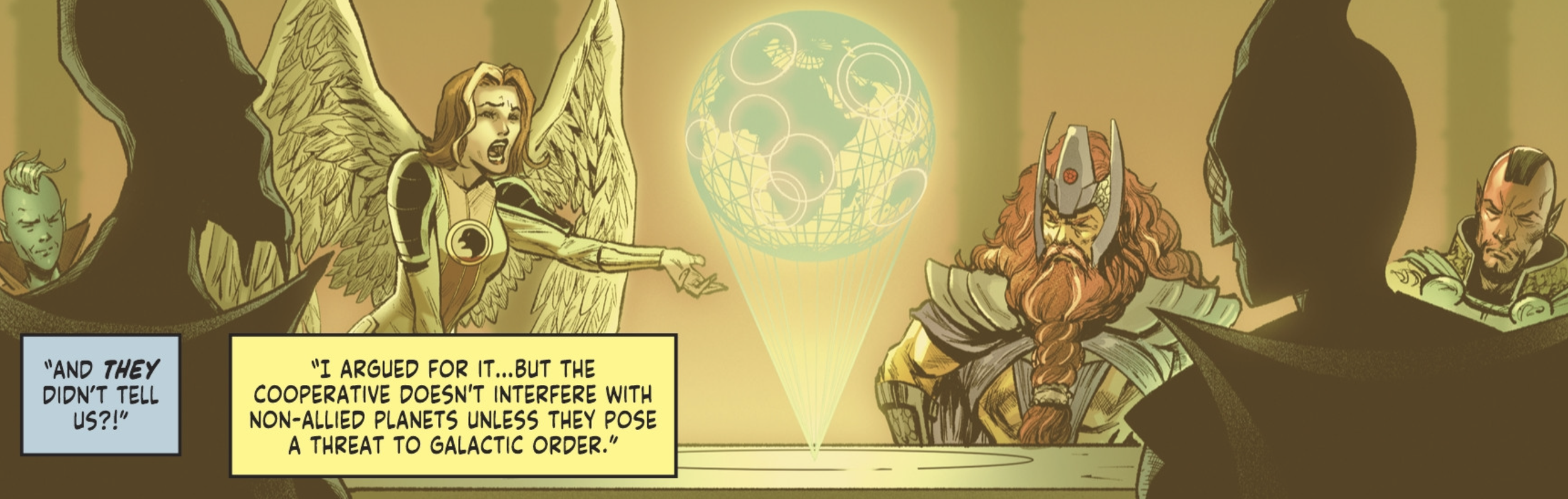 That outer space Q-Juice piece isn’t the only part of the puzzle that Narcisse begins to put together—the first issue where we were thrust into a galactic meeting between Static and Cooperative Council with no context; well, now we finally revisit that storyline. Narcisse takes me as the reader into deep space, during a Cooperative Council meeting, where they are still discussing whether or not Earth should be included in the galactic treaty and designate Earth as an ally. This writing was really fulfilling for me as a reader, because all of a sudden, I felt a part of this story—recalling the story arc to a narrative that was introduced in the first issue made me as a reader feel like I knew what was going on, helping me to become more invested in the second half of this story from Narcisse.