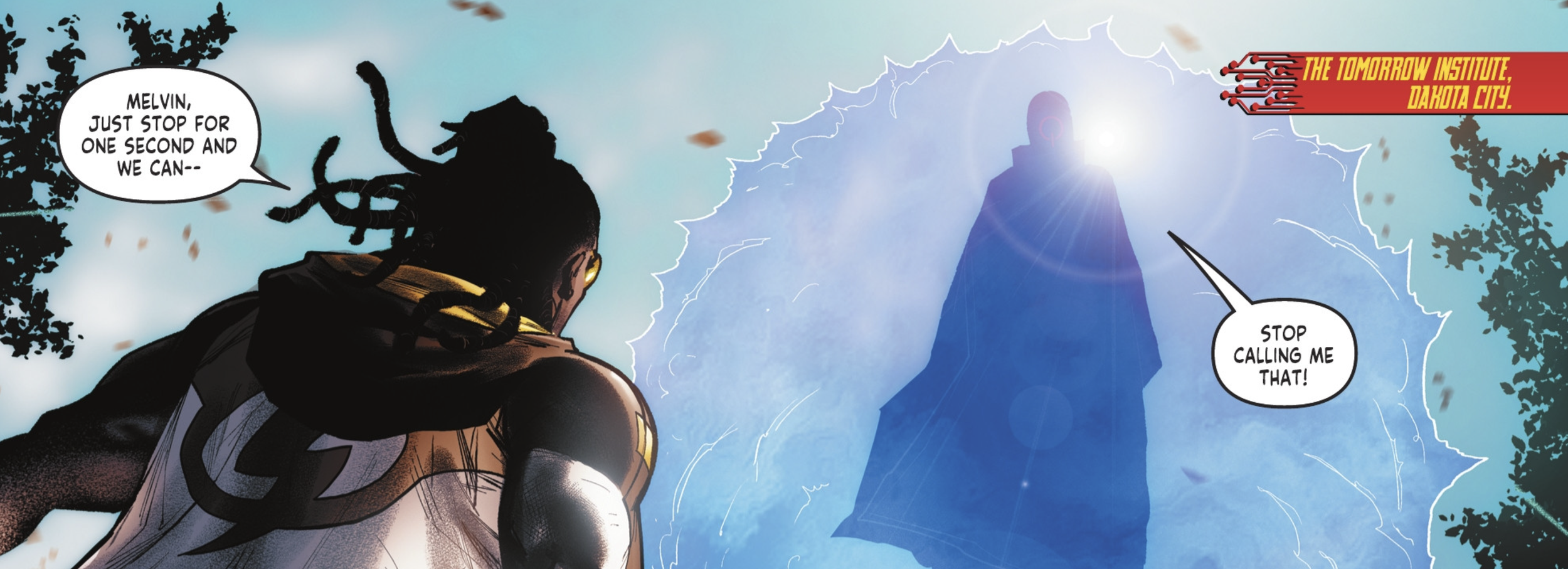 The story felt more layered, contextual and easier to follow in Batman / Static : Beyond #4. Shutdown’s confrontation against Static and his students from the Institute of Tomorrow made sense in how it ended—Shutdown is beaten but not defeated. Narcisse has made it clear that Melvin aka Shutdown doesn’t control or understand his powers yet, so as he’s about to be defeated, he teleports himself out of that situation. Makes sense, because nobody knows the full extend of what he’s capable of yet.