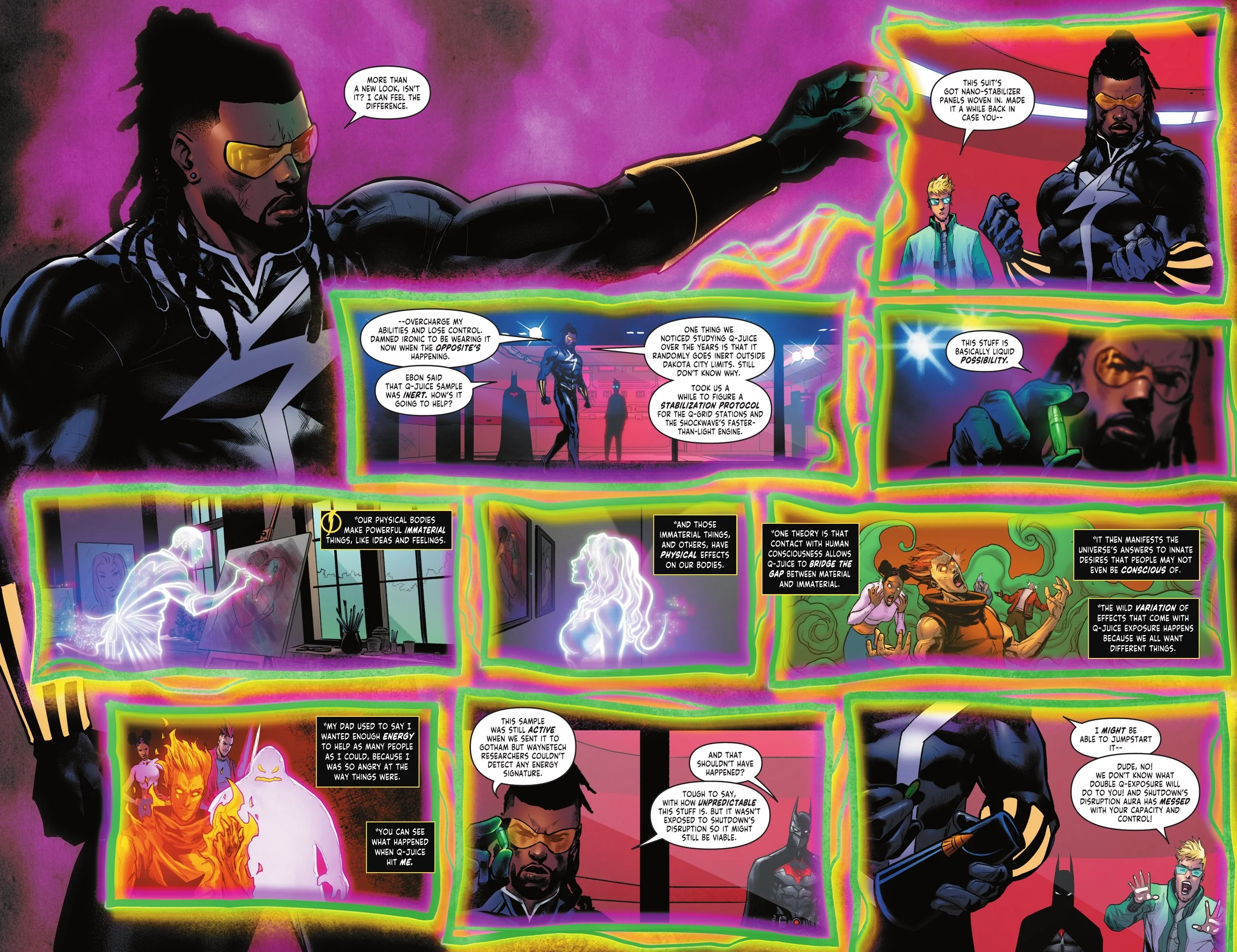 Then there’s the page where Static is figuring out how the outer space Q-Juice can help him get his powers back to 100% and beyond, allowing him to effectively battle and beat Shutdown. What I loved about this page is Mendonca’s use of panelling, it felt like I was a part of the thought process and step-by-step methodology of how Static figured out his solution. I want to shout out the colouring of Quintana of the panels, which made them catch my eye in the best way—psychedelic colour themes of purples, yellows and greens made it feel like a real mind trip, and gave me insight into how Static’s brain works.