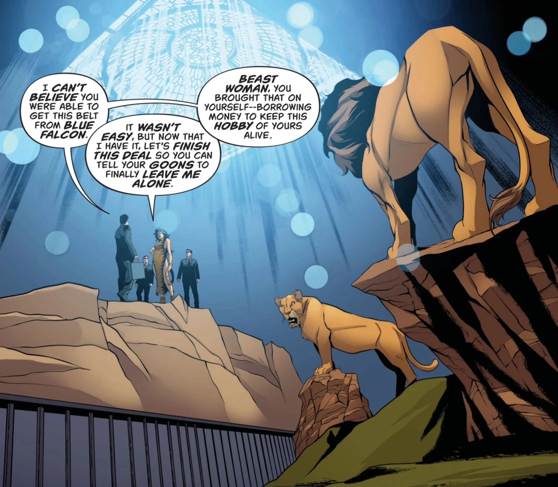 Blue Falcon is recovering at home after the hospital attack. He is physically vulnerable and strategically compromised, because the anti-gravity belt has been stolen. The woman responsible is not just a thief, but someone capable of turning that technology into something far more dangerous.