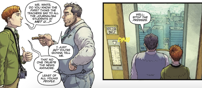 What follows is one of the best parts of the entire issue. Some people might feel this next section is a little too dialogue heavy but not me. Jimmy and Perry argue about why Jimmy deserves a job at the Daily Planet and over the course of the next five pages, the pair of Planeteers have one of the best conversations in a comic this year. Jimmy pleads his case as best as he can while Perry plays devil’s advocate at every turn. I honestly believe this issue is worth the read just for this scene between Perry and Jimmy. Smith and Carrasco’s dialogue is fantastic.