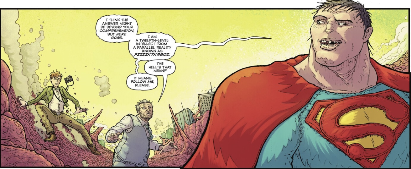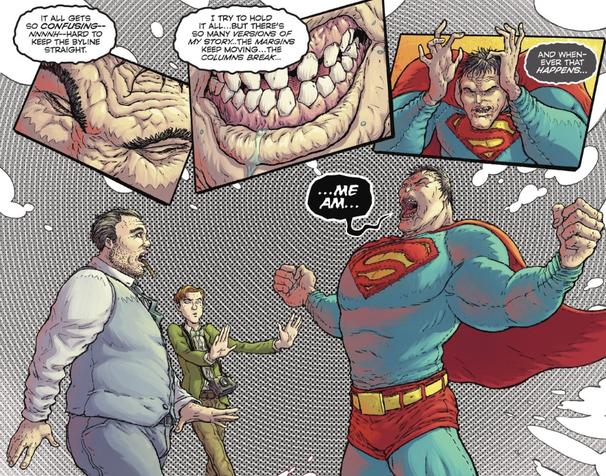Bizarro explains to Jimmy and Perry that he found the copy of the Daily Planet that came through the green portal that we were shown in the beginning of the issue and created this version of Metropolis and the Daily Planet on this version of Bizarro world. The reason he went back through the green portal was to grab Jimmy and Perry so they could run the Daily Planet and teach his people how to be good reporters. Its an insane plot and very fitting of a chaotic being like Bizarro. Speaking of Bizarro, we finally get a glimpse of the being we’re all familiar with when during the conversion with Jimmy and Perry, he speaks about how everything sometimes gets confusing with there being “so many version of his story” and for the briefest of moments we get the backwards talking Bizarro we all know before he quickly regains control of himself. Bizarro makes Jimmy the Editor-In-Chief of his twisted version of the Planet and makes Perry the coffee guy before he flies off to the edge of the world and looks off contemplating something.