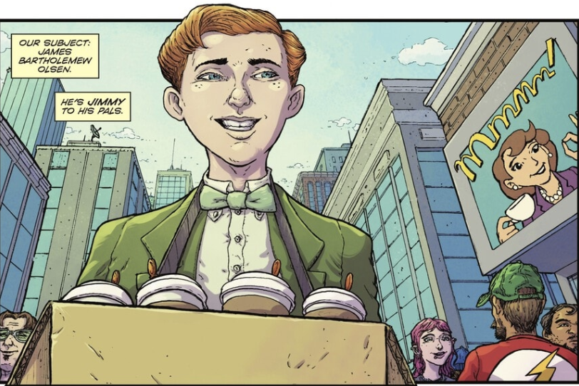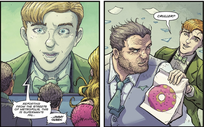 After a striking title card, we meet one of the series’ three main characters: James Bartholomew Olsen. Jimmy isn’t yet the world-renowned photographer of the Daily Planet; he’s still the coffee-and-donuts guy, trying to carve out a place for himself in one of the biggest cities in the DC Universe. Walking through the bustling streets of Metropolis, Jimmy charms his way past civilians and city chaos, giving readers a sense of his personality and resourcefulness.