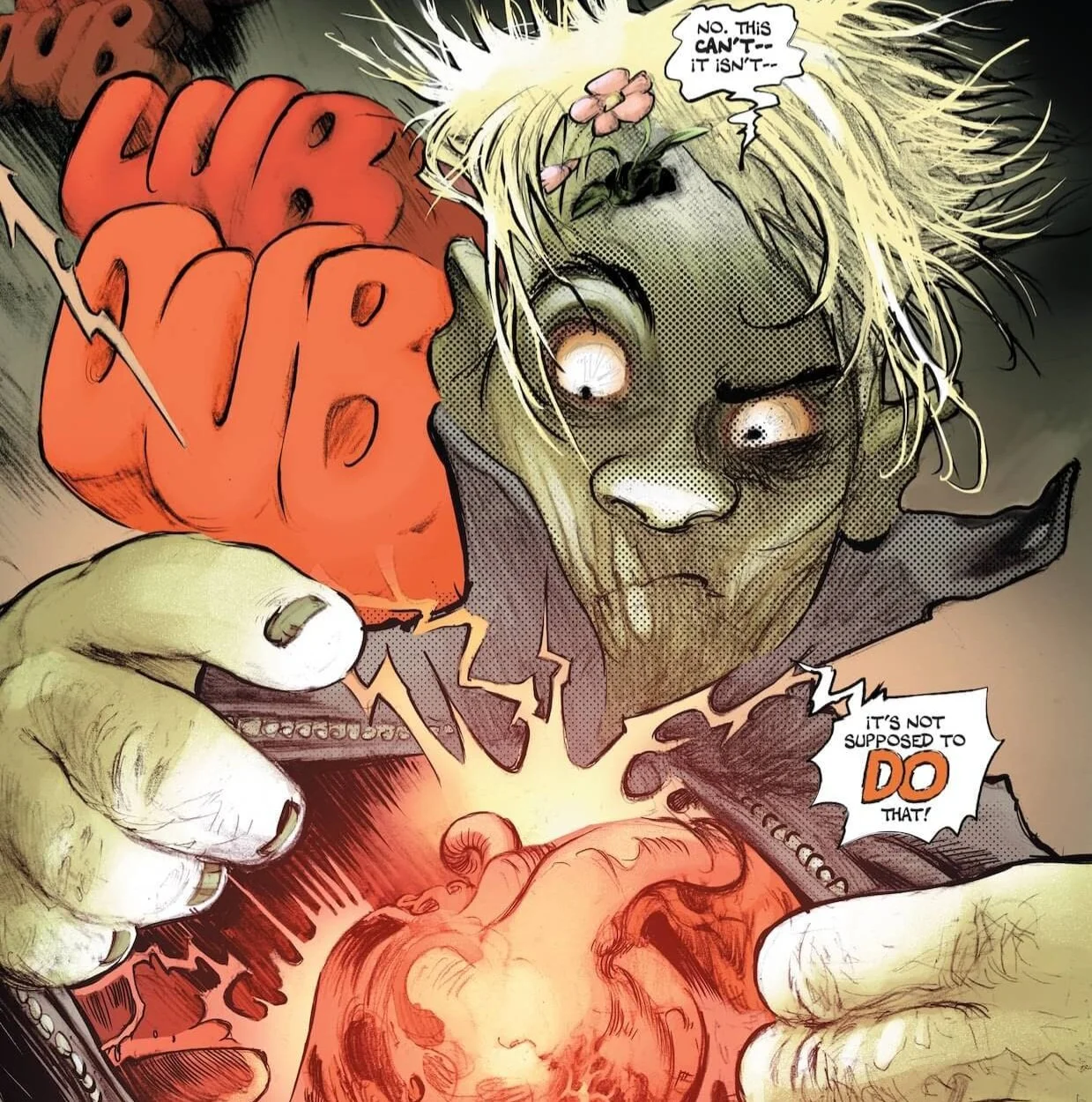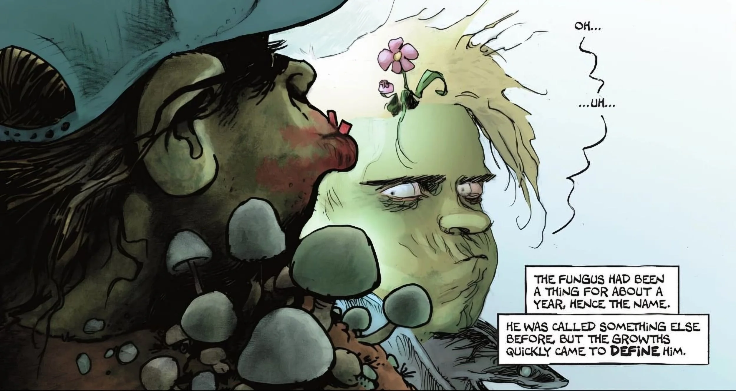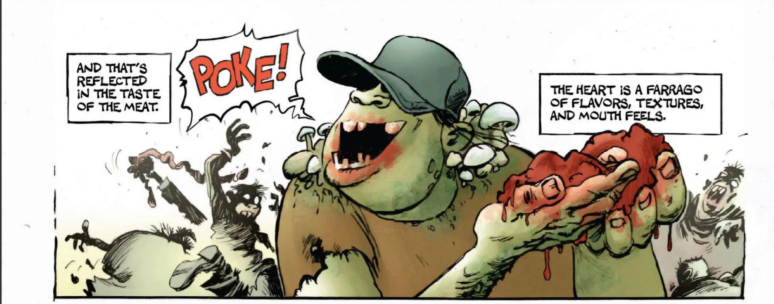 I don’t think we learn a whole lot about our protagonist, Poke, in this first issue—aside from the fact that he’s from Arizona and is beginning to experience empathy for the living. To be fair, we don’t really need to know everything immediately; issue #1 is very clearly focused on world-building and establishing the status quo. It looks like issue #2 will dive deeper into who Poke is, especially since (spoiler alert!) he stumbles upon two human survivors on the final page. This sets the stage for us to see his moral character in action: will he eat them, or will he help them hide from his less empathetic buddy, Mush?