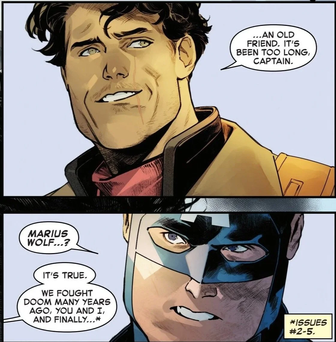 Cap balks at the ideas and is about to give Salvation a piece of his mind when the masked man reveals himself to be Marius Wolf. He is the freedom fighter contact that Cap met with years ago during his first trip to the kingdom that was once ruled by Doctor Doom. Wolf offers a disarming smile as he reminisces about fighting alongside one another. He gladly offers to personally escort the team to Castle Doom so they can do their job.