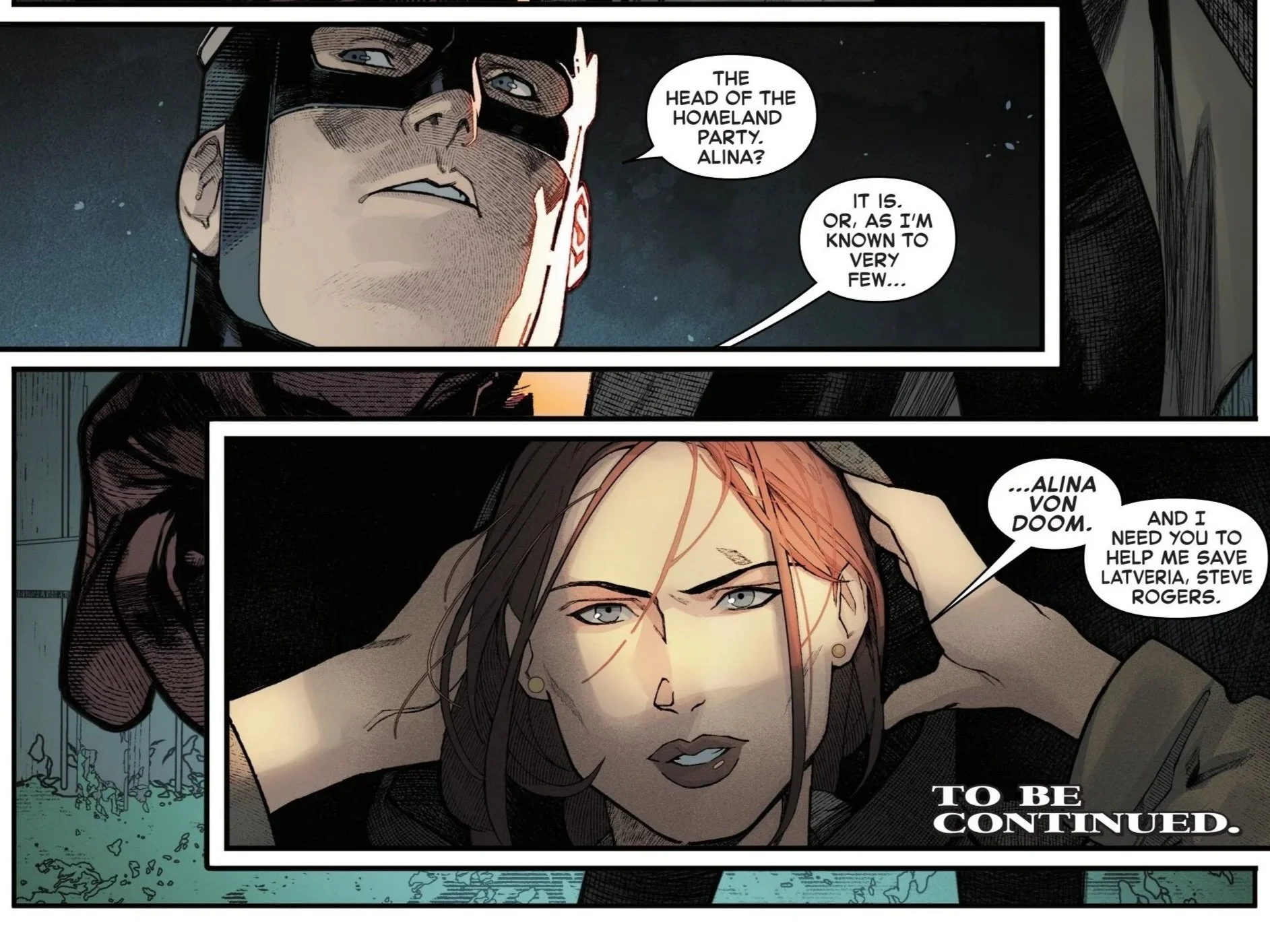 As Steve demands that the man talk, the woman asks that he calm down. She apologizes for following him here, but she informs him that were it any less dangerous, they would have approached him in daylight. The Avenger recognizes the woman as Alina and identifies her. She pulls down her hood to reveal her face and acknowledges that she is indeed her. Or, as she is known to very few, Alina Von Doom! The issue comes to a close as she pointedly asks Steve for his help to save Latveria.