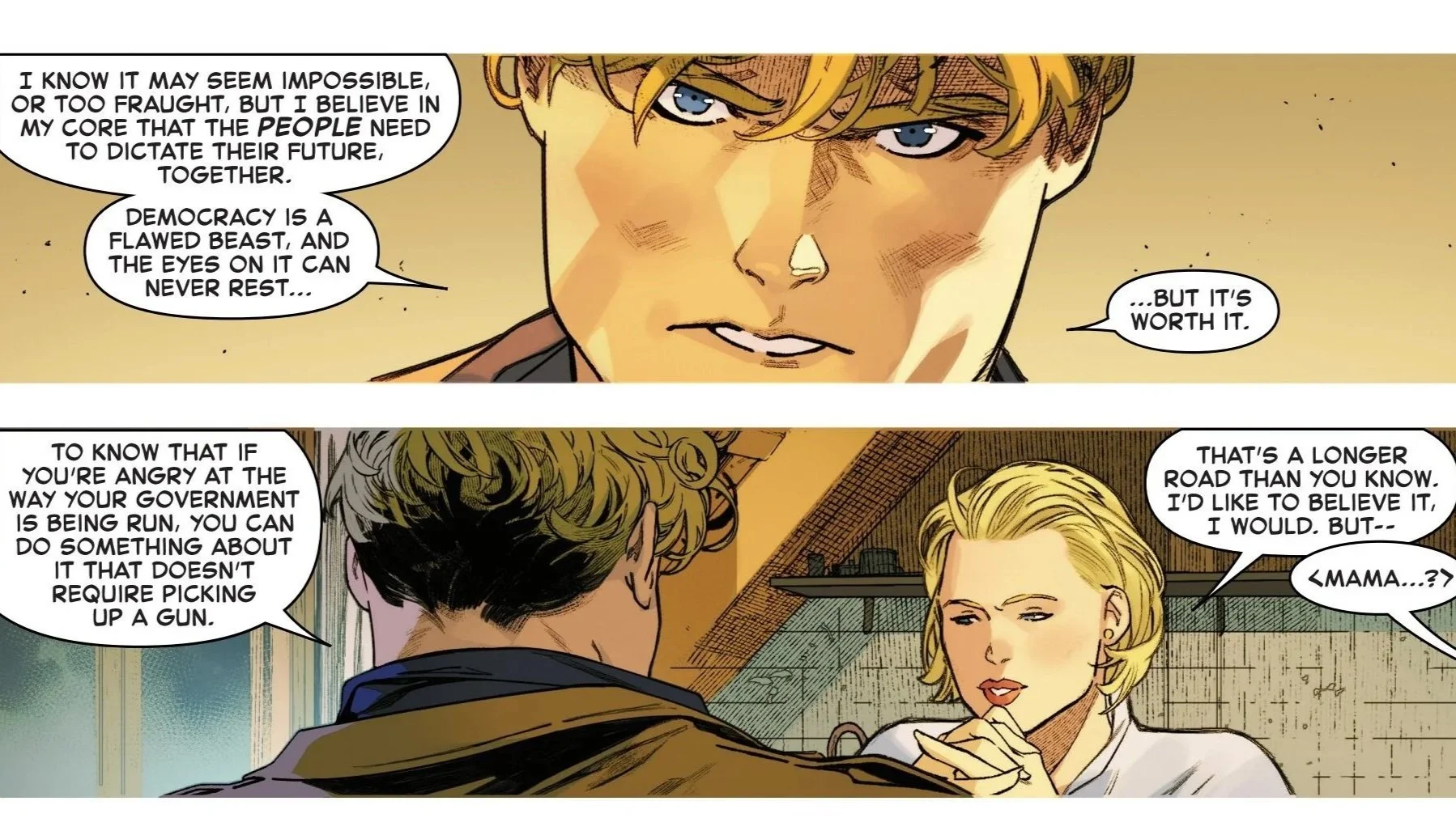 With a greater sense of understanding the myriad Latverian politics and the lack of any real easy answers to go forward, Steve offers Mirel his own thoughts. He tells her that the people of Latveria need to stick together and choose democracy together. He explains that it is a restless fight. It must be defended and watched constantly, but ultimately, it is worth it. Mirel says she would like to believe it could work, but her son quickly and quietly warns her and Steve that someone is lurking in their backyard.