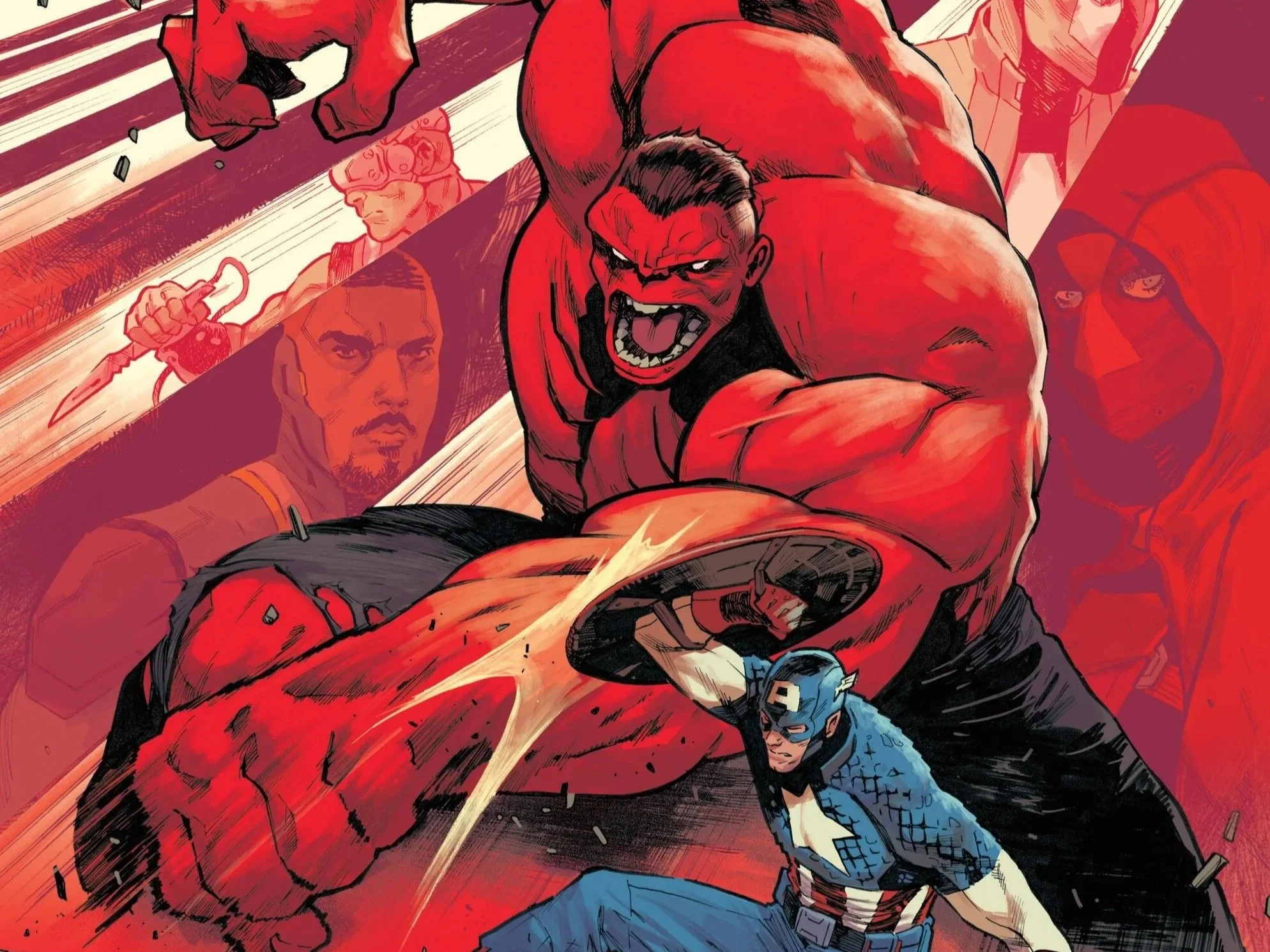 The Red Hulk stands in between Captain America and his S.H.I.E.L.D team.