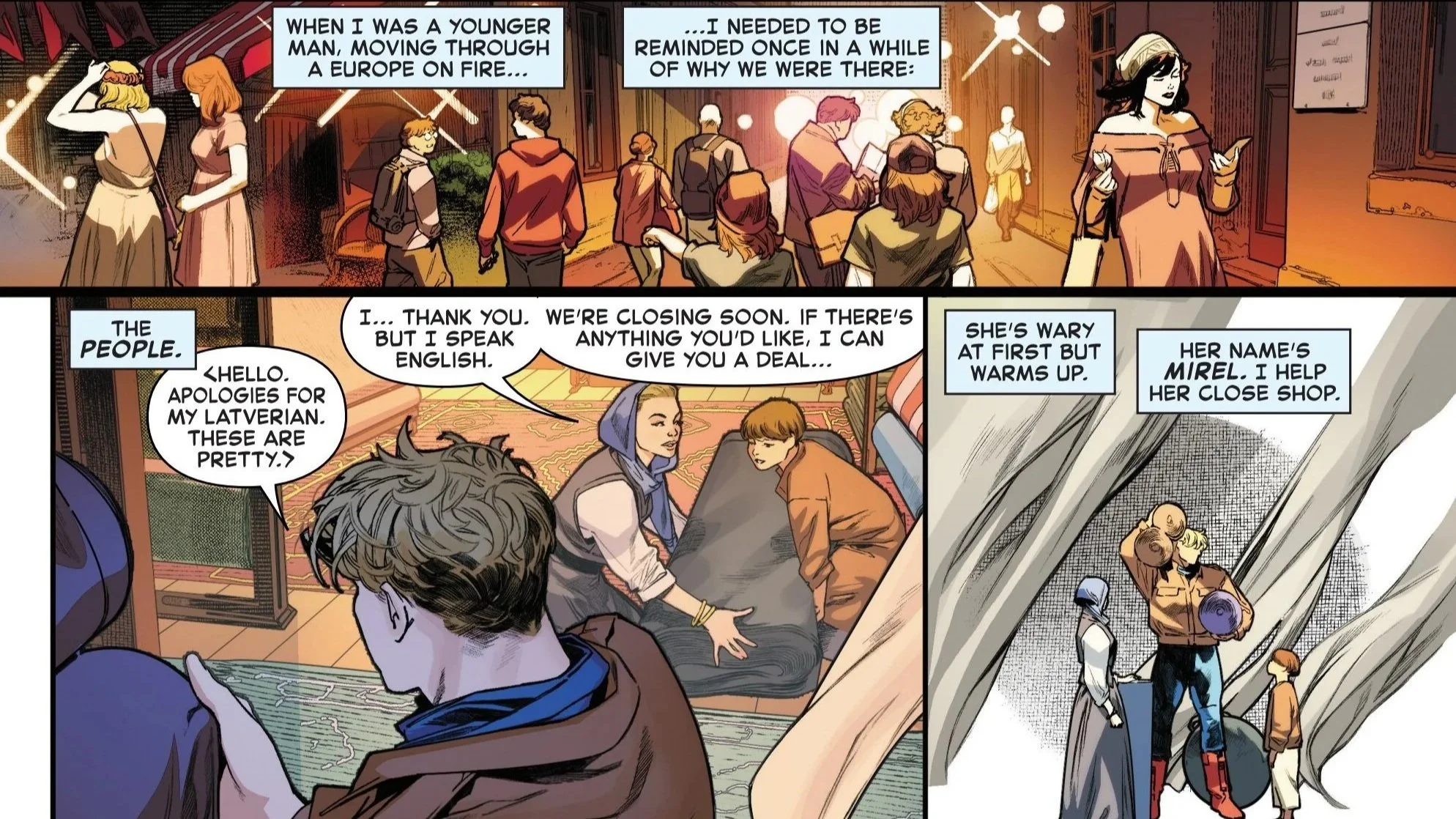 It does not take him long before he encounters a young Latverian woman named Mirel, a humble shopkeeper who sells rugs and carpets. She is wary at first, but she warms up to Steve as he helps her close up shop. Eventually, she offers him dinner at home with her son. The two discuss the current state of affairs in Latveria, and Mirel expresses doubt that Latveria will ever truly be free or have legitimate elections. She accuses Marius of being behind the disappearance of the boyfriend of her sister.