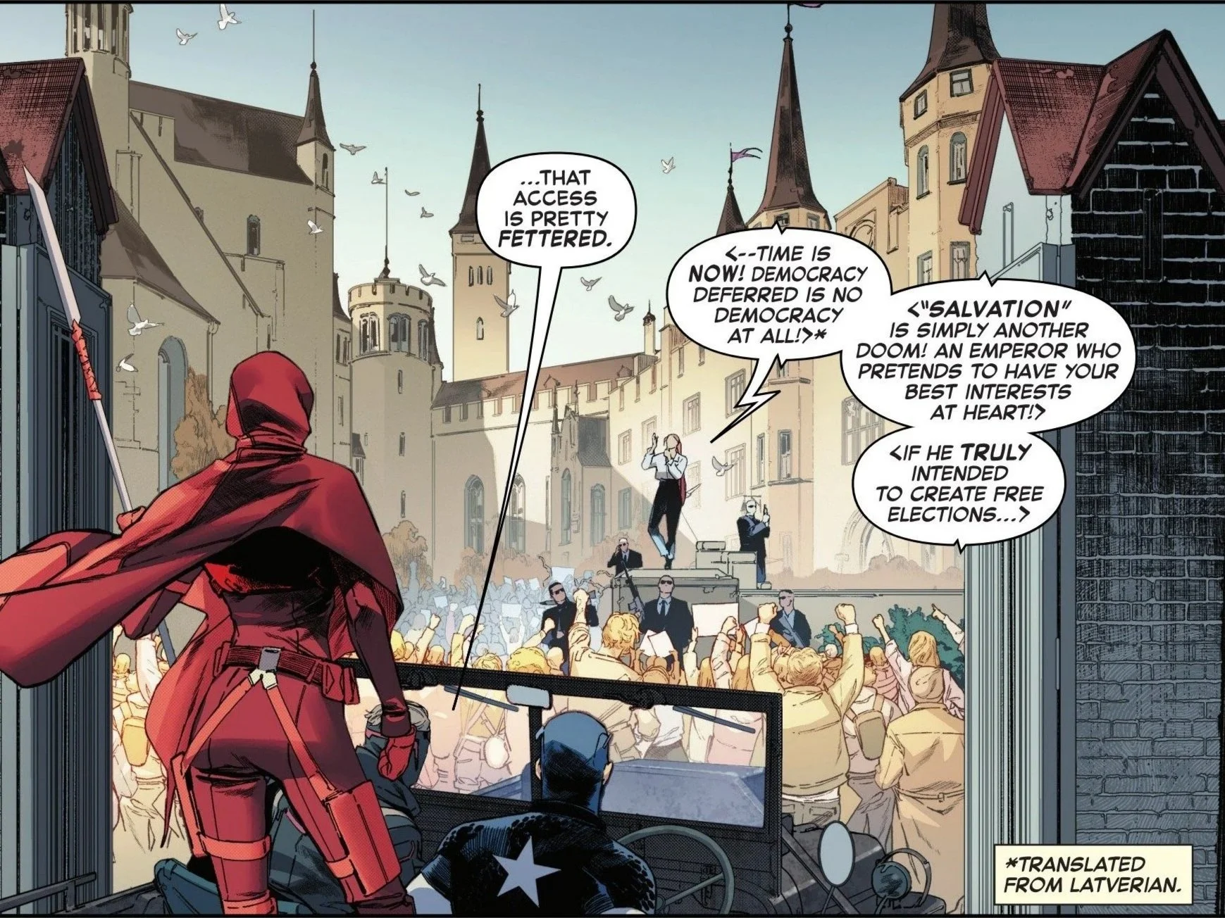 The team quickly arrives at the town square, with Castle Doom looming just ahead as a crowd of onlookers surrounds Alina. She is the leader of the Homeland Party, which is the second of the three Latverian factions vying for control. Cap can mostly follow along with what Alina is shouting to the civilians. She claims that Salvation, the masked figure who leads the True Latveria faction, is just another version of Doom. She argues he has no desire to create free elections, especially since he has taken the symbol of the Latverian monarchy as his own and instituted martial law. Cap is explaining that the Homeland Party is pacifists when gunfire suddenly occurs two to three blocks east of their location.