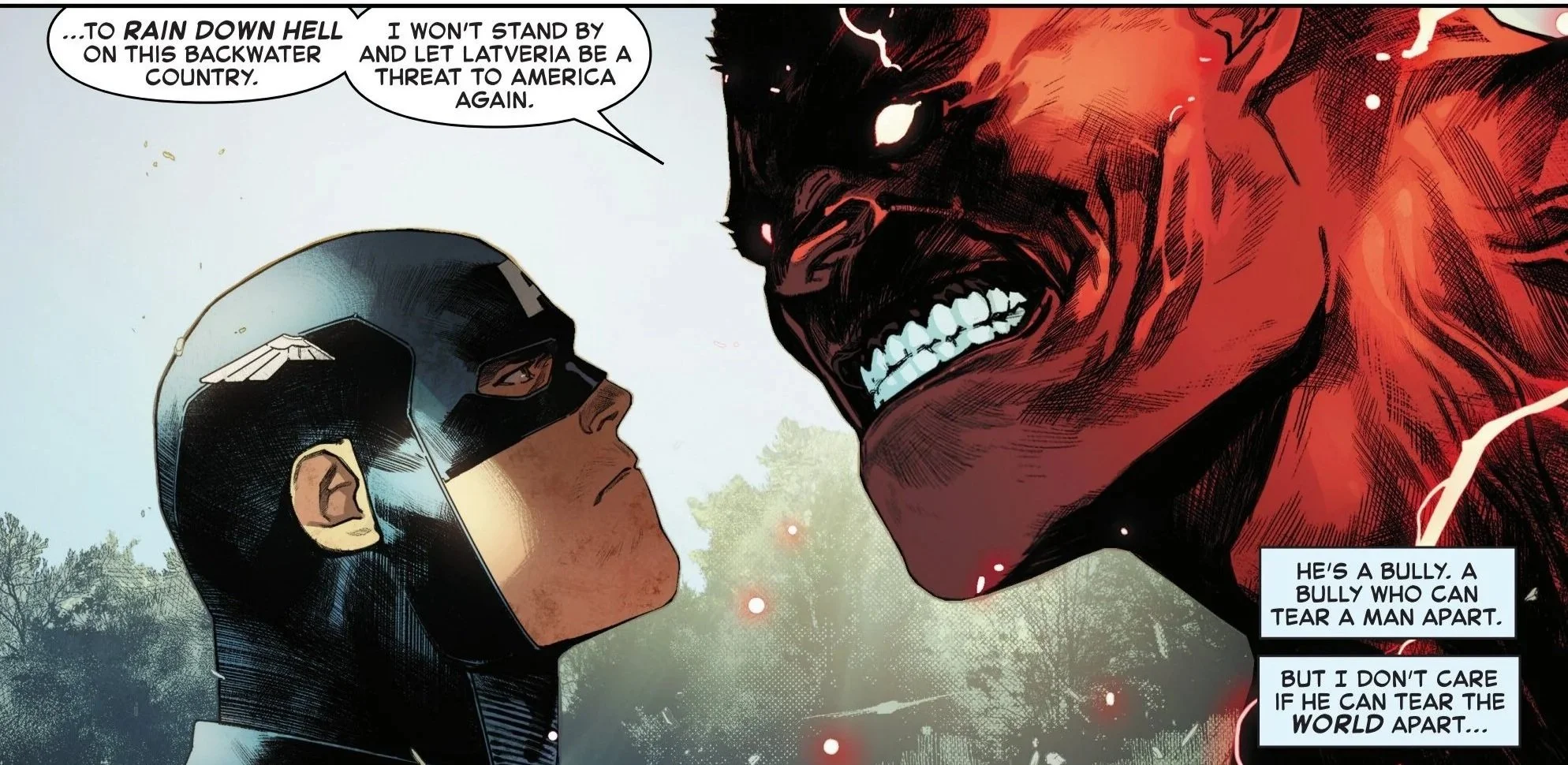 Our issue picks up immediately where the previous ended, with Captain America staring down the Red Hulk. Steve Rogers regards the transformed Thunderbolt Ross as he explains he is not a soldier here in Latveria. He is certainly not one who is following the orders of Ross, like that fateful mission years ago, when Steve had just been freshly thawed out of the ice. Furthermore, he tells Ross that he is with S.H.I.E.L.D. and has a mandate to go into Latveria unobstructed. Unimpressed, Ross tells him that his mandate comes from weak back channels that seem to think that the name Fury means something. He ominously tells the Sentinel of Liberty that the United States of America is here to protect Latveria from Rogers, the bumbling of his team, and themselves.