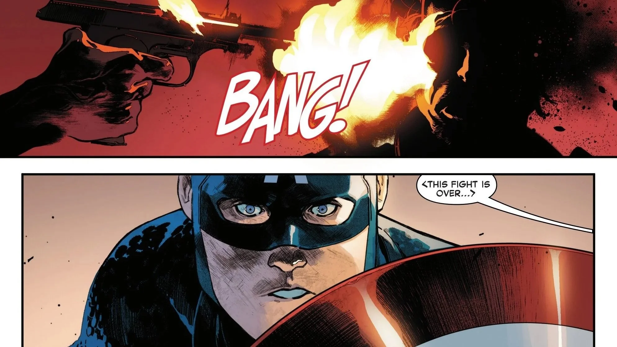 Cap manages to defend his team from the searing fist of the Red Hulk.