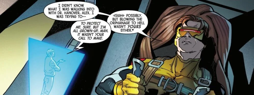 On the Quinjet given to him by Beast, Cyclops receives an angry call from Alex Summers. He scolds Cyclops saying that even though they aren't on great speaking terms, he could of at least called him when he visited their old orphanage before it's completely demolished for a Roxxon business building.