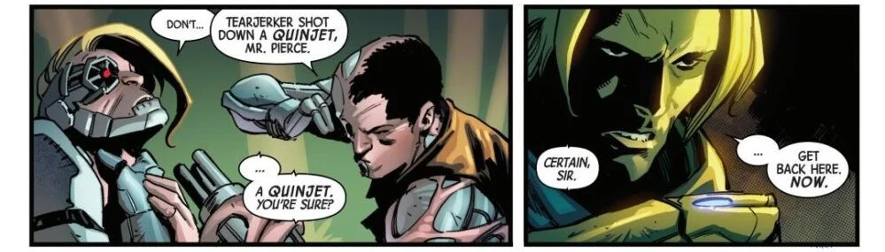 Sockeye grabs Tearjerker and tells him that he's an idiot for doing that and that Mr. Pierce won't be happy. And almost right on time, Mr. Pierce who's underground tells them that they heard an explosion above them and he hopes that it doesn't involve them. Sockeye quickly rats out Tearjerker for shooting down an Avengers Quinjet leading Pierce to tell them to leave immediately.